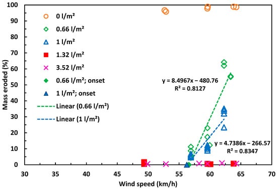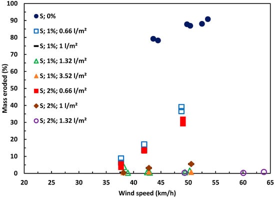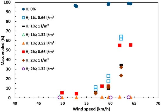 Raw experimental data showing the percentage of eroded dry soil mass versus the average wind speed for horizontal and sloped test configurations are shown in Figure 7 and Figure 8, respectively.
