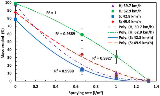 Next, the percent of eroded soil mass is plotted against the spraying rate for selected constant wind speeds (Figure 11). The data are grouped by spraying rates. Overall, the mass eroded shows a quadratic decay with increasing spraying rate.