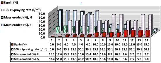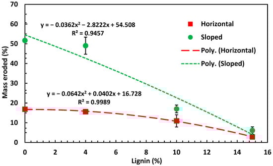 It is observed that, unlike in the case of wind erosion, lignin solution concentration is the primary factor controlling the amount of erosion for both horizontal and sloping soil configurations, with larger amounts of erosion observed in the latter case (Figure 11). Both figures indicate that a 10% lignin solution concentration was necessary to observe a noticeable decrease in erosion, which was more pronounced for the sloping configuration. A further decrease in erosion was achieved by increasing the lignin concentration to 15%.