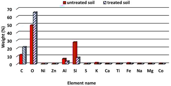 SEM and EDS scans of treated and untreated soils are presented in Figure 14, Figure 15, Figure 16, Figure 17 and Figure 18. In SEM scans of untreated soil (Figure 14 and Figure 16), the edges of soil particles are clearly discernible, while that is not the case in SEM scans of treated soil (Figure 15 and Figure 17). Clearly, the addition of lignin fills the pores and provides a thick, abundant coating of particles.