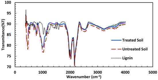 FTIR spectroscopy of soil, lignin, and soil treated with lignin.
