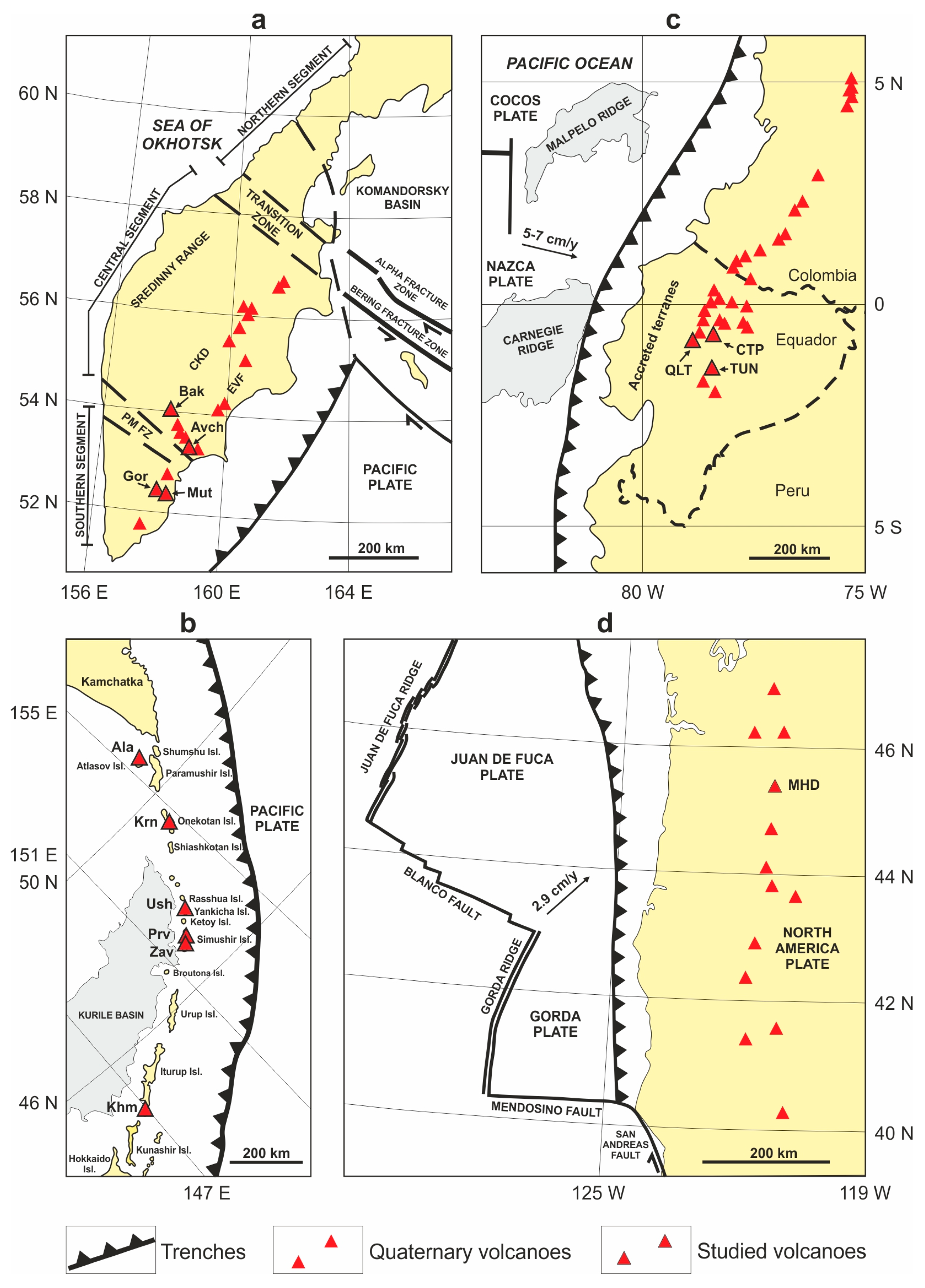 - Erlich, E.N.; Gorshkov, G.S. Quaternary volcanism and tectonics in Kamchatka. Bull. Volcanol. 1979, 42, 13–43. [Google Scholar]
