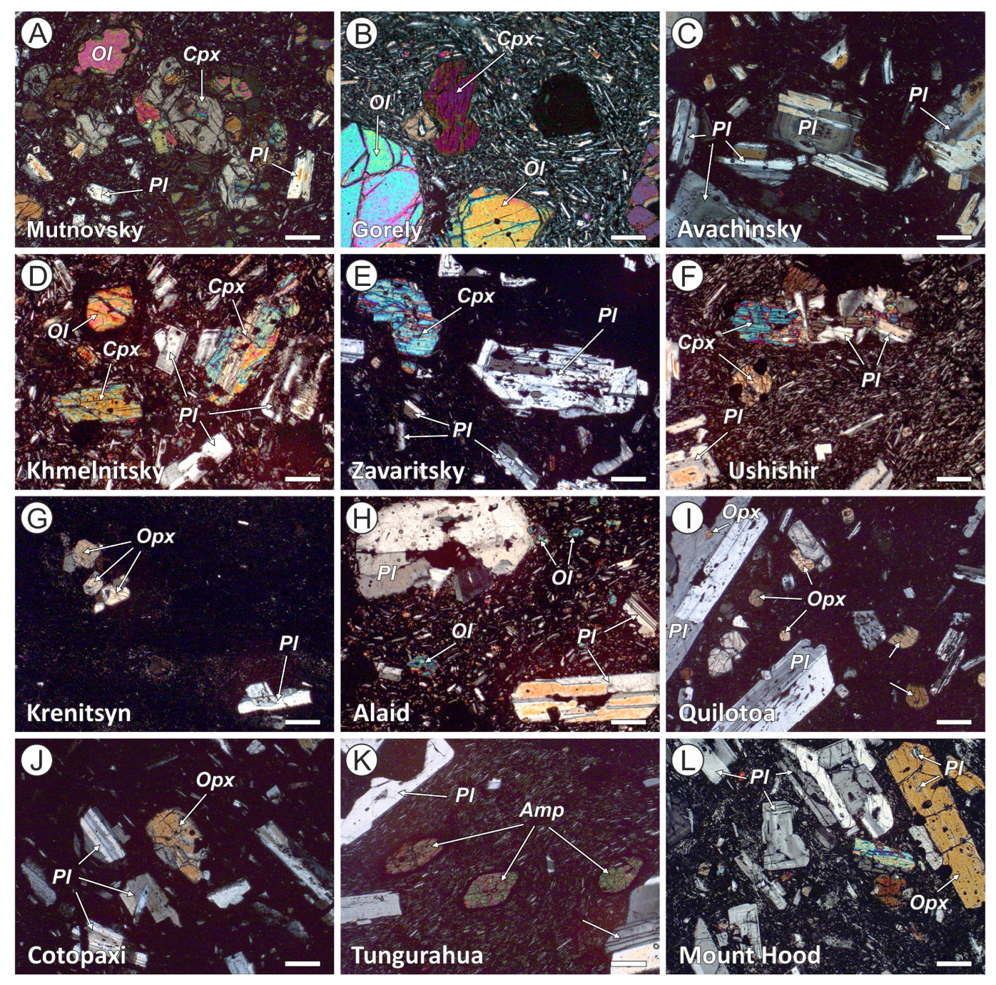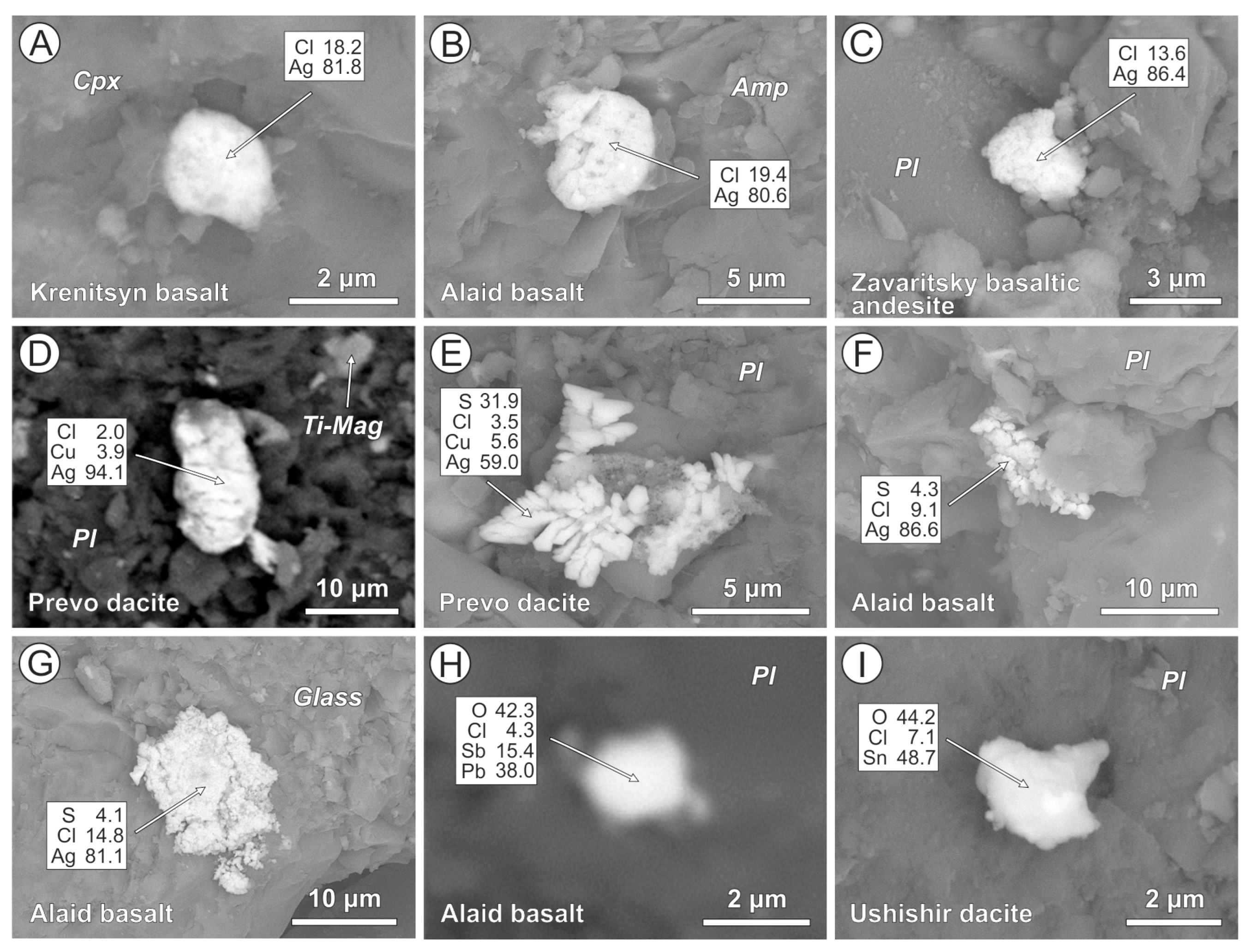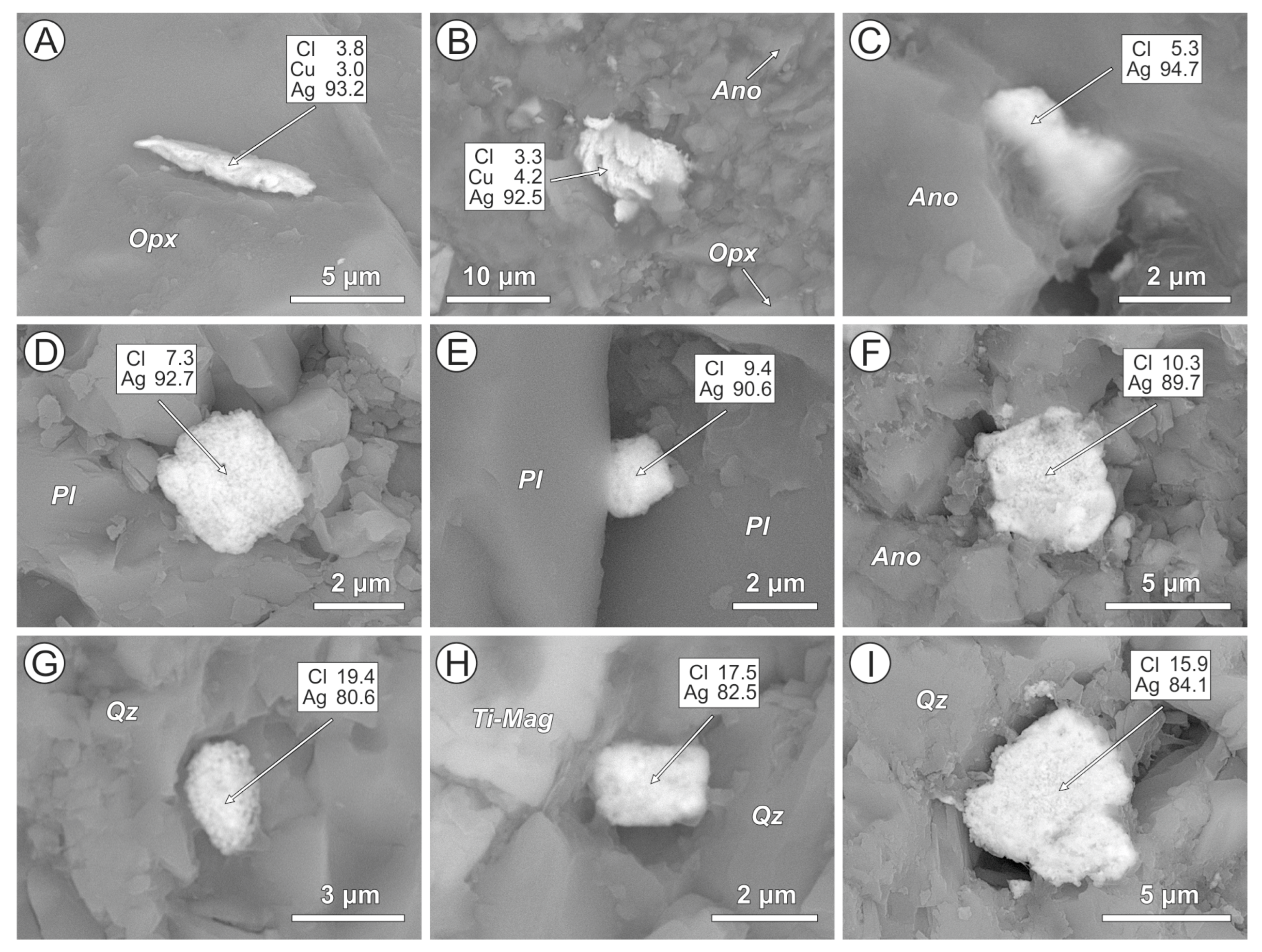 - Some Cl-bearing microinclusions are enclosed in magmatic rock-forming minerals such as olivine, ortho- and clinopyroxenes, amphibole, plagioclase, anorthoclase, and quartz and could have crystallized from the immiscible Cl-rich melts exsolved from volcanic arc magmas during their differentiation in the sub-arc crust. Alternatively, specific microinclusions with Ag-S-Cl compositions may record the oxidation and decomposition of earlier magmatic sulfides in the presence of Cl-bearing magmatic volatiles.