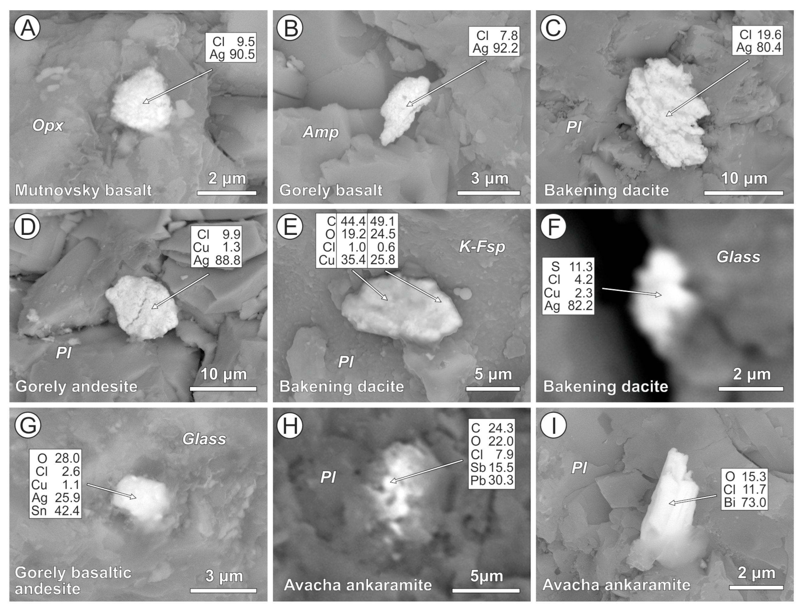 | Mutnovsky | Basalt | AgCl, Cu-Ag-Cl and zincite + AgCl composites | Orthopyroxene, amphibole, and plagioclase | Cu-Sn alloy, acanthite, Cu-Ag-sulfide, and barite | |