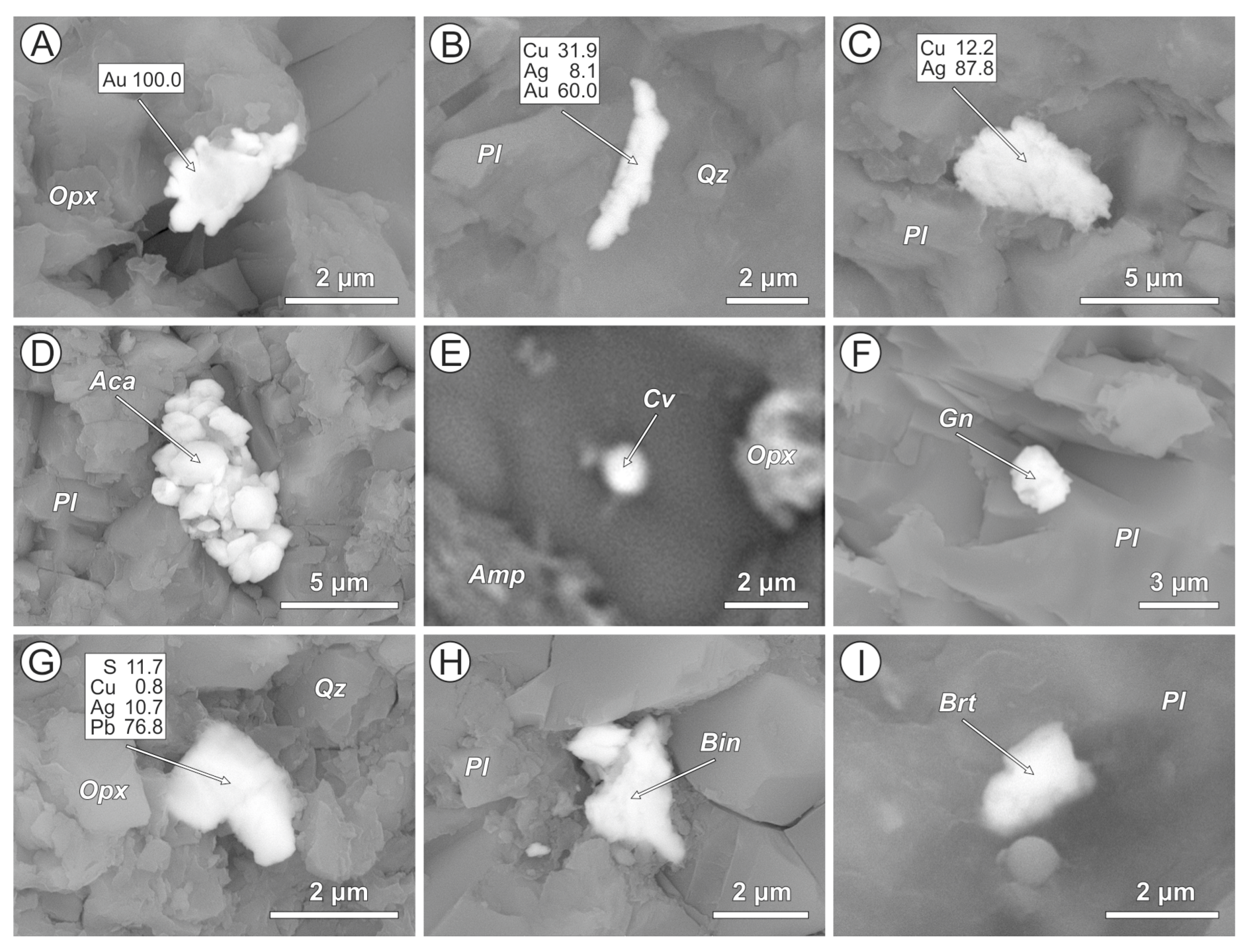 | Prevo | Dacite | Cu-Ag-Cl, Ag-Cl-S, and Cu-Ag-Cl-S | Plagioclase | Cu-Ag-sulfide | |