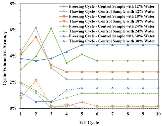 Volumetric strain (γ) of control silt soil under 10 freezing–thawing cycles, at 12%, 18%, 24%, and 30% moisture content, respectively. All measurements were performed in duplicate. The maximum, minimum, and average standard deviations (σ) for the volumetric dataset were σmax = 0.074%, σmin = 0.013%, and σavg = 0.025%, respectively.
