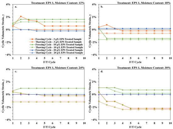 Volumetric strain (γ) of EPS 1-treated silt soil under 10 freezing–thawing cycles, where (a) 12%, (b) 18%, (c) 24%, and (d) 30% moisture content, respectively. All measurements were performed in duplicate. The maximum, minimum, and average standard deviations (σ) for the volumetric dataset were σmax = 0.052%, σmin = 0.0%, and σavg = 0.031%, respectively.