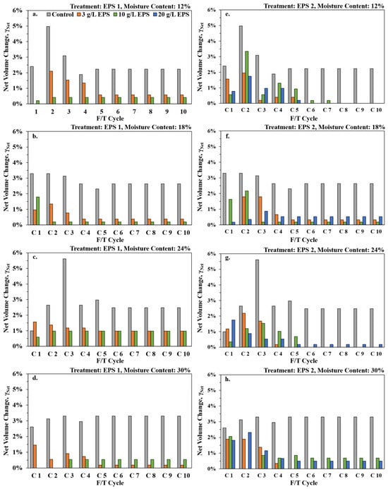Net volumetric strain (γNet) of control, EPS 1, and EPS 2-treated silt soils during 10 freezing–thawing cycles (C1–C10) at (a,e) 12%, (b,f) 18%, (c,g) 24%, and (d,h) 30% moisture contents, respectively.