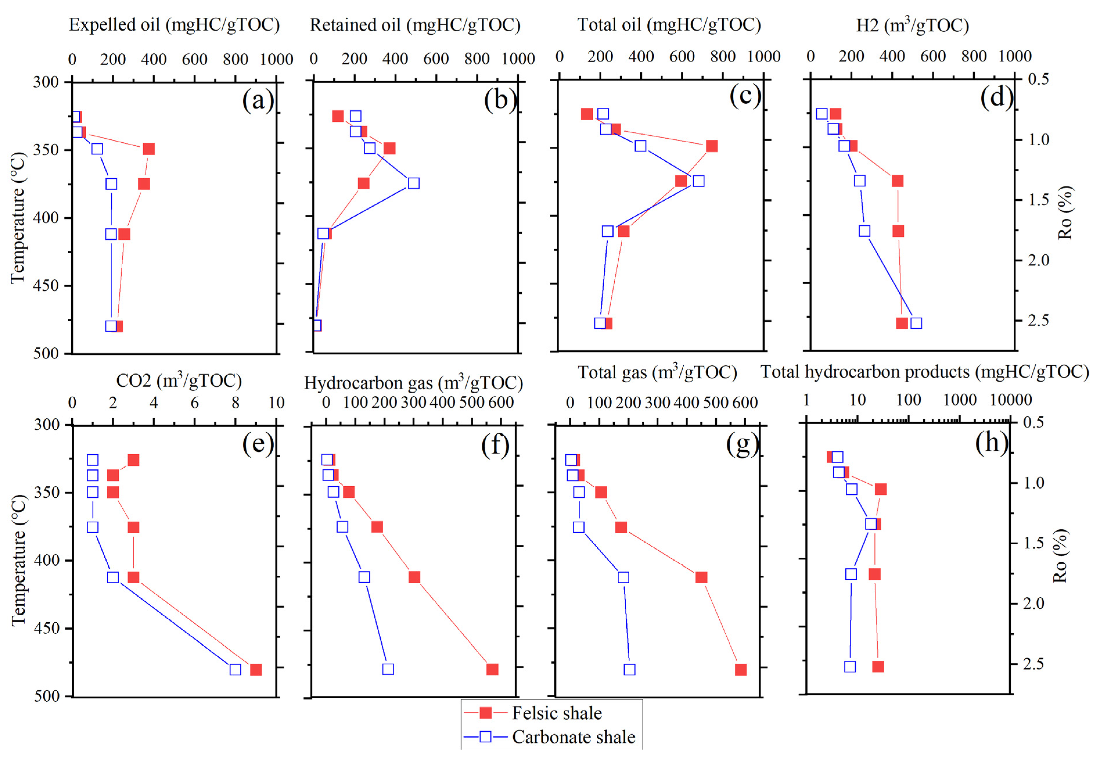 | Sample Style | Temperature, °C | Expelled Oil, mgHC/gTOC | Retained Oil, mgHC/gTOC | Total Oil, mgHC/gTOC | H2, m3/gTOC | CO2, m3/gTOC | Hydrocarbon Gas, m3/gTOC | Total Gas, m3/gTOC | Total Hydrocarbon Products, mgHC/gTOC |