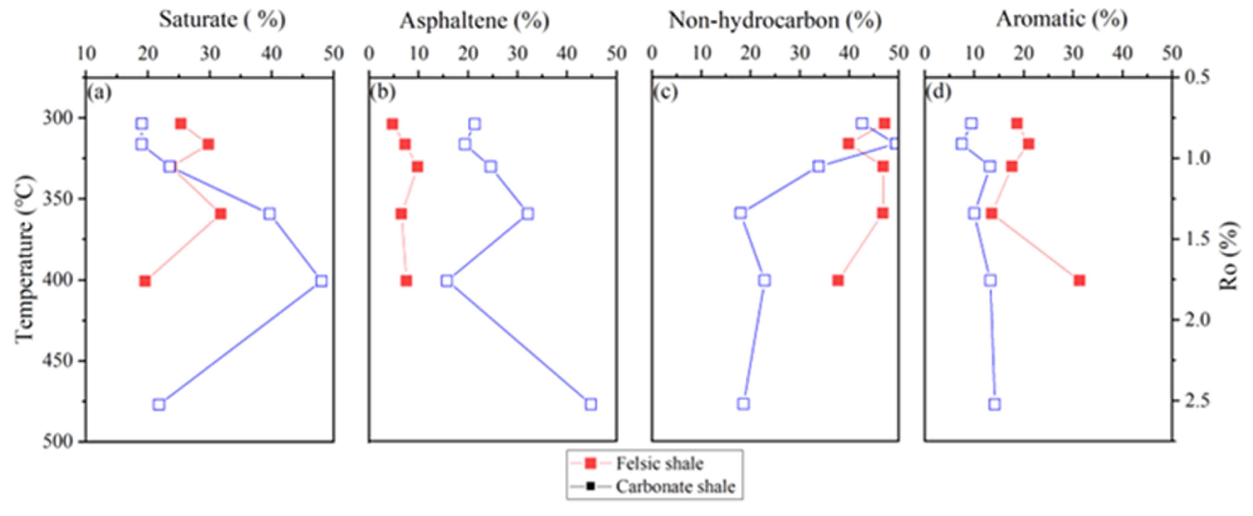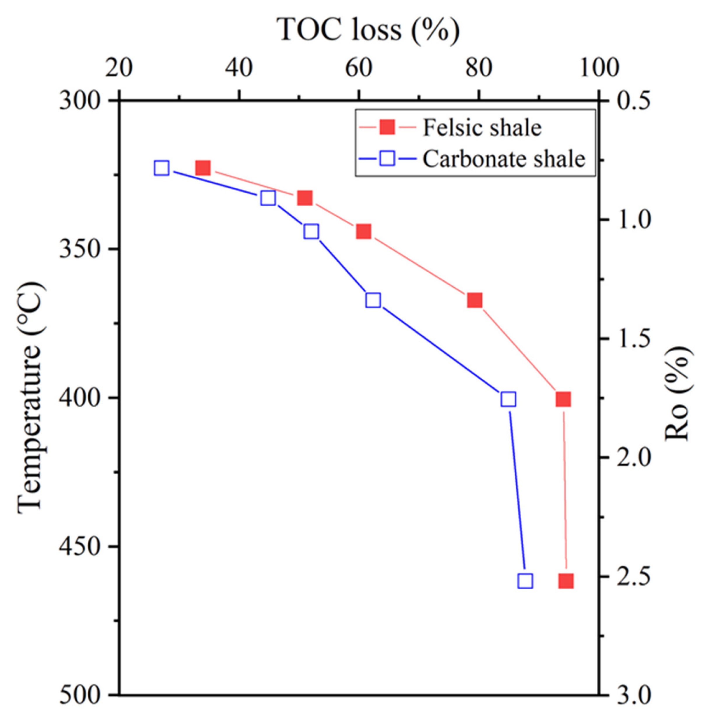 - Shao, X.; Pang, X.; Li, M.; Qian, M.; Hu, T.; Li, Z.; Zhang, H.; Xu, Y. Hydrocarbon retention in lacustrine shales during thermal maturation: Insights from semi-open system pyrolysis. J. Pet. Sci. Eng. 2020, 184, 106480. [Google Scholar] [CrossRef]