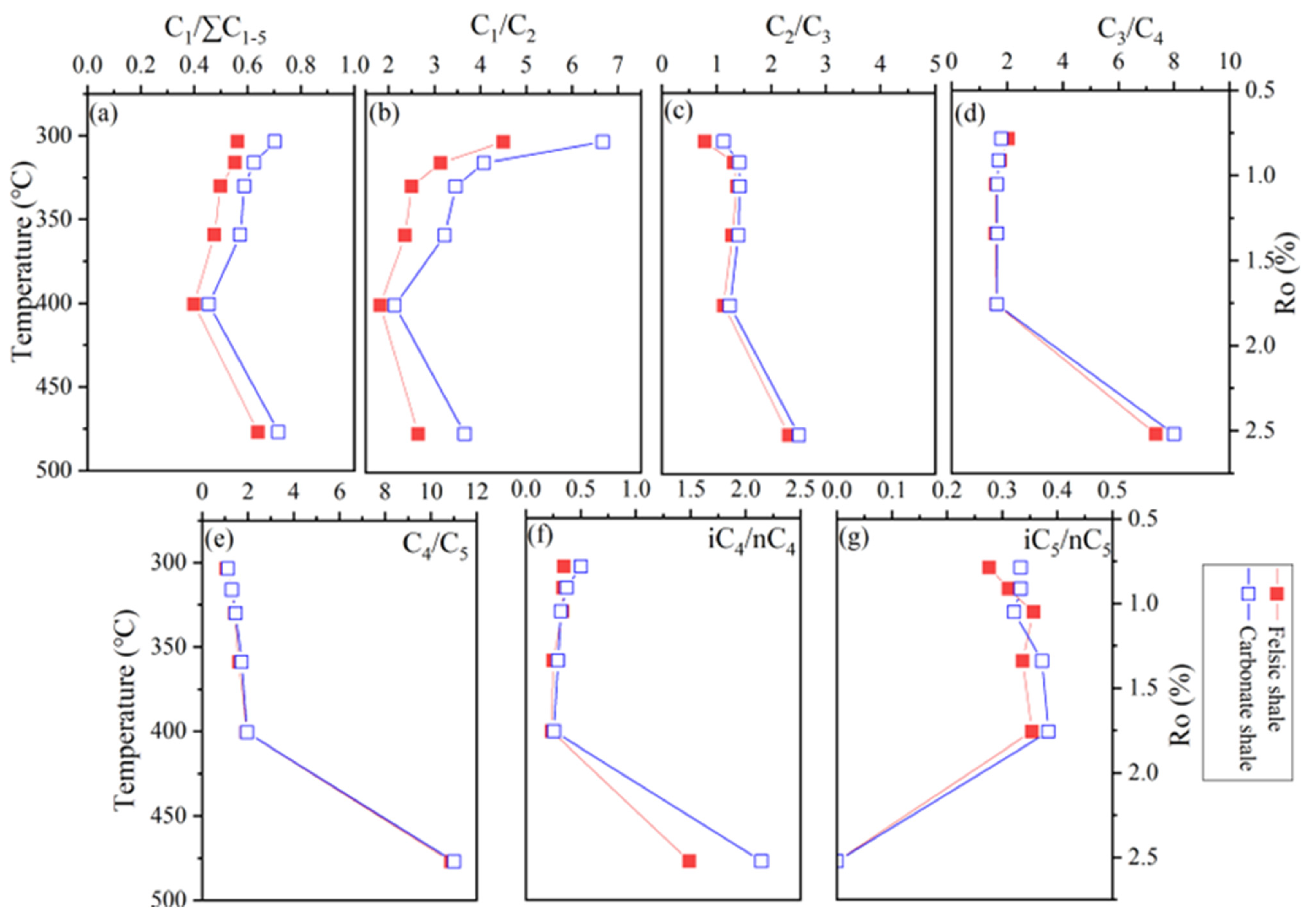 - Guo, L.; Xiao, X.; Hui, T.; Song, Z. Distinguishing gases derived from oil cracking and kerogen maturation: Insights from laboratory pyrolysis experiments. Org. Geochem. 2009, 40, 1074–1084. [Google Scholar] [CrossRef]