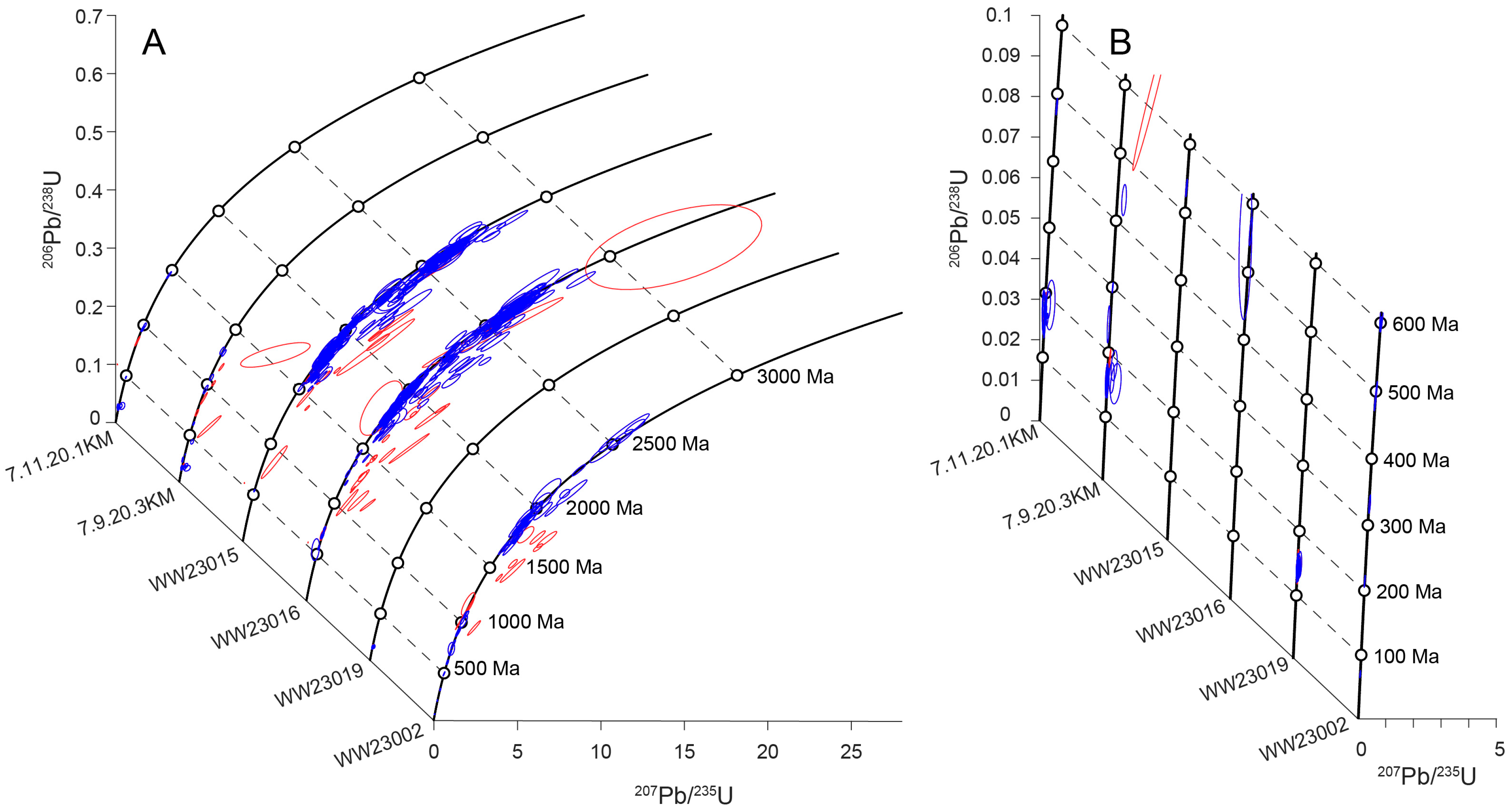 | Age ± 2σ (Ma) | Age ± 2σ (Ma) | MSWD | n | Age ± 2σ (Ma) | MSWD | n | Age ± 2σ (Ma) | Mz | Pz | Ptz | A | pre-Mz | ||