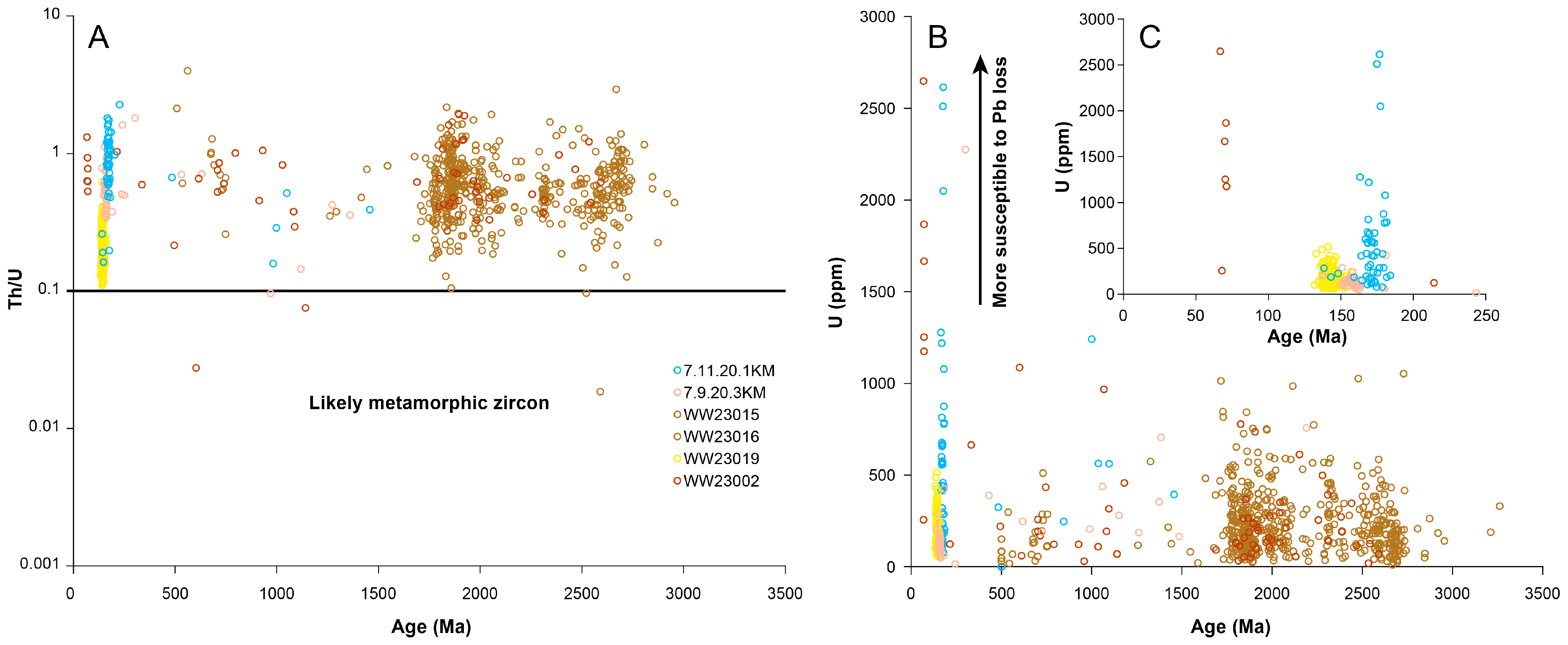 - A young ~145 Ma population of detrital zircon ages in the central WHT is younger than crosscutting intrusions and suggests Pb loss during an episode of metamorphism, possibly related to the intrusion of the Western Klamath suite.