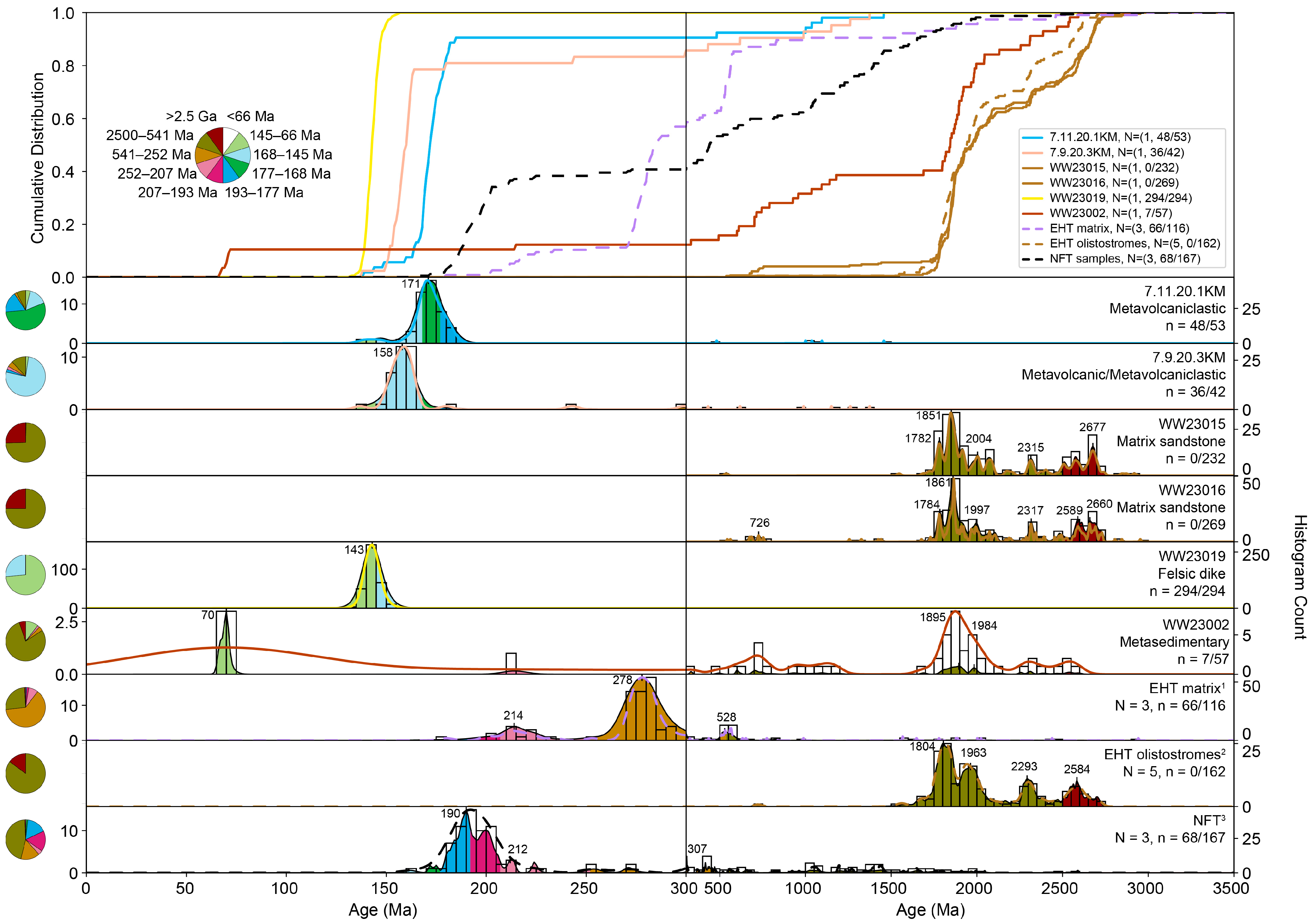 - The southern EHT matrix includes mafic volcanic rocks and olistostromal sandstone, which are locally mixed. One matrix sample has detrital zircon ages similar to olistostromal blocks and matrix in the EHT, but it is significantly more metamorphosed, and the youngest zircon age population is 69 Ma, consistent with minor Late Cretaceous detrital zircons in the Klamath Mountains from previous studies, which is difficult to explain by contamination. The young grains may have experienced lead loss during metamorphism, but this does not match any known episode of magmatism or metamorphism. We tentatively suggest that the young grains record previously unrecognized local metamorphism and/or magmatism ≤69 Ma, potentially related to local dikes and/or hydrothermal fluids.