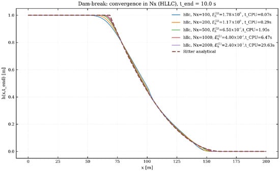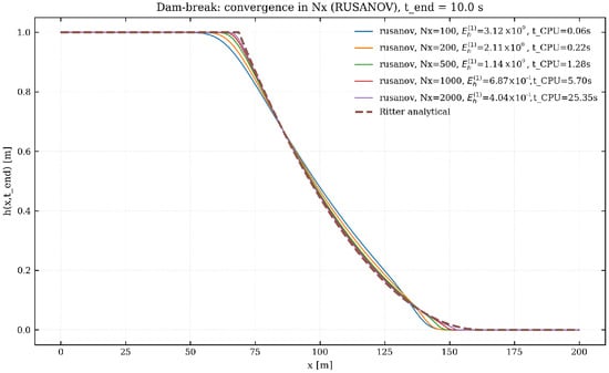 3.9. Validation of the Numerical Solver: Dam-Break Test Against Ritter’s Analytical Solution