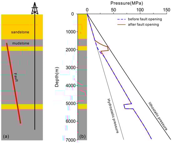 The characteristics of the fault-transferred overpressure. (a) Profile and position of the fault. (b) Simulated pressures before and after fault opening.