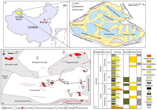 (a) The map of the Junggar Basin showing the structural distribution and the location of the central Junggar Basin. (b) Schematic geological map and well distribution of Fukang Sag. (c) Generalized Jurassic stratigraphic column of the Fukang Sag (Modified from [30]).