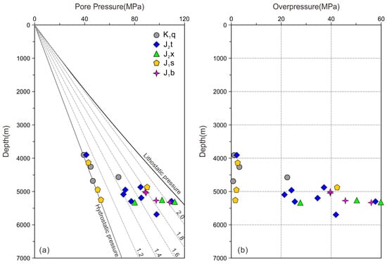 Overpressure is predominantly developed below 4200 m and in the J2t, J2s, and J1b formations. The pressure coefficients in these zones mostly range from 1.2 to 2.0, reaching a maximum of 2.1, corresponding to excess pressures of 20–50 MPa, with a maximum of 58 MPa (Figure 3b). Notably, the pressure coefficients in overpressure zones do not exhibit a systematic increase with depth. Instead, significant variation is observed at similar depths, reflecting the complex overpressure generation mechanisms in the sandstone reservoirs.