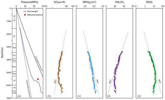 Pore-pressure and comprehensive-mudstone-compaction curve of well D3 in Fukang Sag. (a) The relationship between pore pressure and depth. (b) The acoustic transit time versus depth. (c) The density versus depth. (d) The neutron versus depth. (e) The resistivity versus depth.
