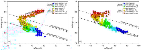 To investigate the overpressure generation mechanism in mudstone, the acoustic transit-time–density cross-plots were constructed for the deeper wells, D3 and D8. In normally pressured intervals, the data follow a normal compaction trend, characterized by acoustic transit time decreasing and density increasing with depth. Below a certain depth, however, the density exhibits a rapid increase that deviates from the shallow normal compaction trend, establishing a new compaction trend with increasing burial depth (Figure 5). In overpressured zones below 5000 m, an inversion is observed in the acoustic transit-time–density response. The simultaneous increase in both acoustic transit time and density is interpreted as a signature of chemical compaction, where diagenetic transformations enhance rock density despite the presence of overpressure.