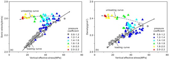 The logging-responses–vertical-effective-stress cross-plots of the Jurassic formation in the Fukang Sag. (a) Sonic velocity–vertical effective stress- cross plot. (b) Density–vertical effective stress cross plot.