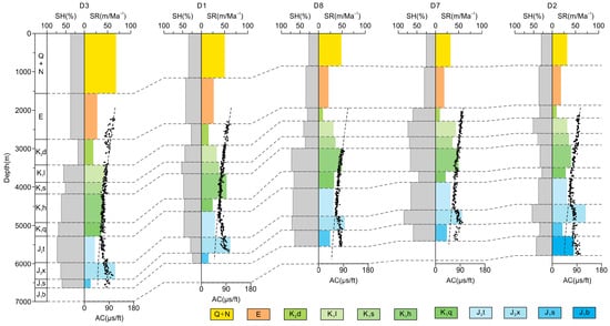 In the study area, representative wells were selected, and shale content (SH) across various formations was calculated from gamma-ray logs, calibrated with cuttings data. Sedimentation rates (SR) were determined by analyzing stratigraphic thickness and chronology. Together, these parameters indicate that the Jurassic sedimentary filling in the Fukang Sag establishes favorable geological conditions for the development of mudstone disequilibrium compaction (Figure 7).