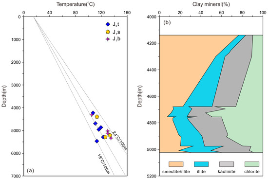 Temperature–depth relationship and variation in clay minerals in the Fukang Sag. (a) The temperature distribution of the Jurassic Formations. (b) Variation in clay minerals in the Fukang Sag.