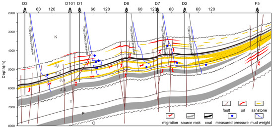The Jurassic hydrocarbon-bearing intervals primarily occur within the J1s and J2t, with industrial oil flow production specifically identified in the J2t. Reservoir types are predominantly characterized by structural-lithologic reservoirs [36]. The J1b deposited widespread coal-bearing strata and dark mudstone, which serve as effective source rocks. Oil-source correlation studies demonstrate that the hydrocarbons in the J1s and J2t mainly originate from dark mudstones of J1b source rocks, with supplementary contributions from dark mudstones of Permian source rocks [37,38]. The source rocks and reservoir formations are not directly connected, exhibiting a fault-overpressure dual-control hydrocarbon-accumulation process [25,39]. Overpressure between the source rock and the reservoir provides migration-driving forces, oil-source rocks serve as pathways for hydrocarbon migration, and effective traps create charging spaces for accumulation [25].