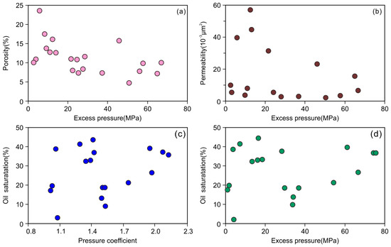 Relationships between overpressure, reservoir physical properties, and oil saturation in the Fukang Sag. (a) The relationship between porosity and excess pressure. (b) The relationship between permeability and excess pressure. (c) The relationship between oil saturation and pressure coefficient. (d) The relationship between oil saturation and excess pressure.