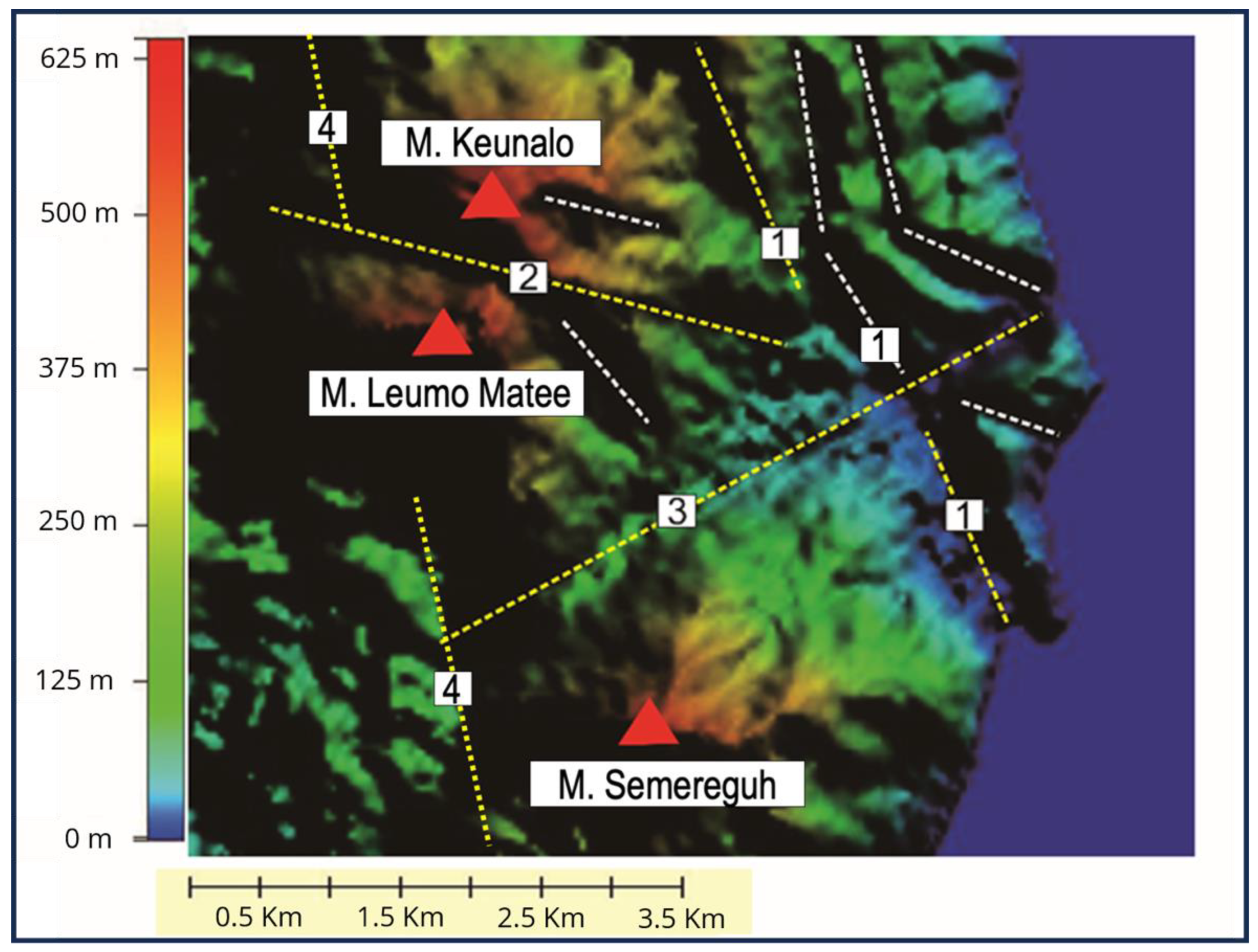 - Marwan, M.; Yanis, M.; Nugraha, G.S.; Zainal, M.; Arahman, N.; Idroes, R.; Dharma, D.B.; Saputra, D.; Gunawan, P. Mapping of Fault and Hydrothermal System beneath the Seulawah Volcano Inferred from a Magnetotellurics Structure. Energies 2021, 14, 6091. [Google Scholar] [CrossRef]