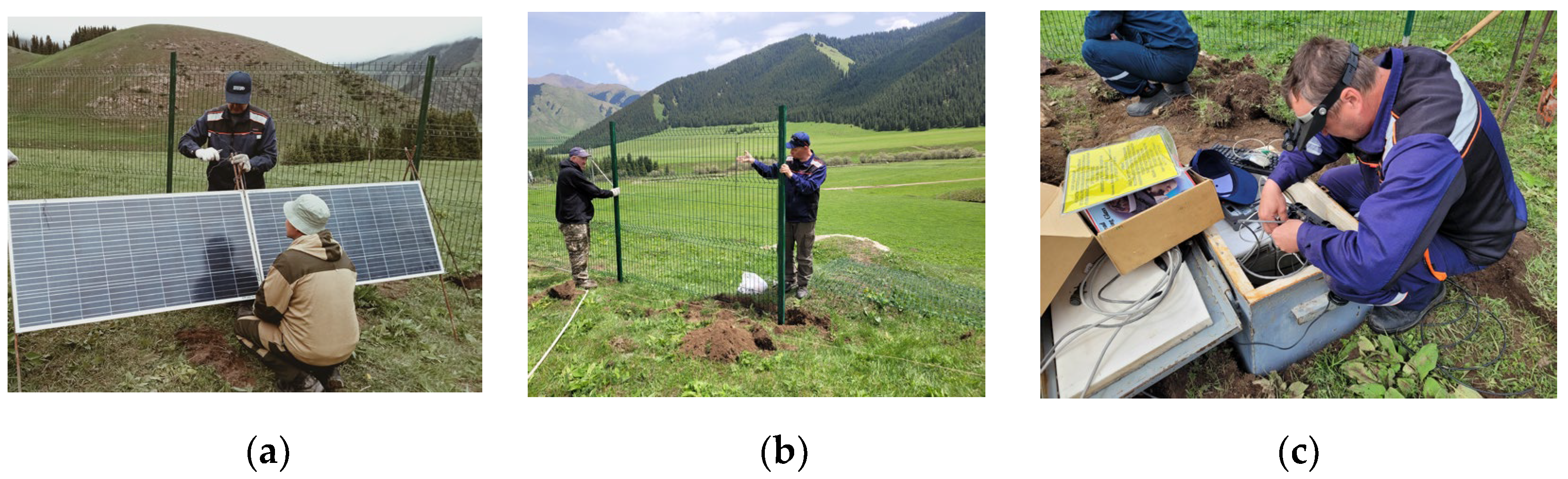 To start the cryoseismological monitoring of the selected area, first, it was necessary to carry out reconnaissance studies to select sites for three observation stations installation. This work was carried out from the end of 2023. The sites were selected based on a set of criteria: On the one hand, the stations had to be located as close as possible to glaciers located on the territory of the Republic of Kazakhstan. On the other hand, it was necessary to follow safety measures to protect the equipment from vandalism; thus, the opportunity of placing the stations on private land was assessed. The sites for the stations’ installation had to be characterized by a low level of seismic noise (both natural and human-made), the presence of dense ground, the absence of swampy or water-saturated soil, and in areas affected by tectonic faults. The Kazakhstan National Data Center (KNDC) analyzed the initial reconnaissance data and studied the comparative possibilities of installing stations in different locations for an extended period. The results are summarized as follows: Seismic stations at all three selected sites are sensitive to events generated by glaciers. No infrasound events associated with glacial earthquakes were detected. Negotiations were held and agreements were concluded with security guards and landowners.