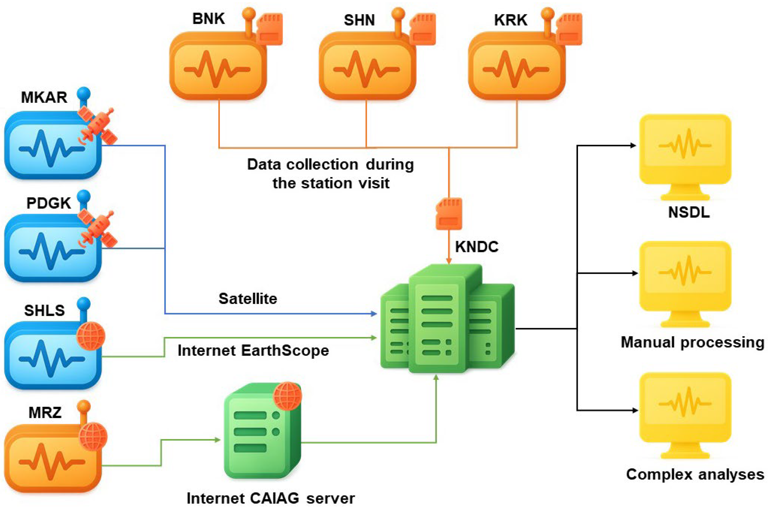 7]. Data from the entire seismic network is transmitted to the KNDC in Almaty via various channels (satellite, internet, delivered by engineers) and converted into a single database for processing (