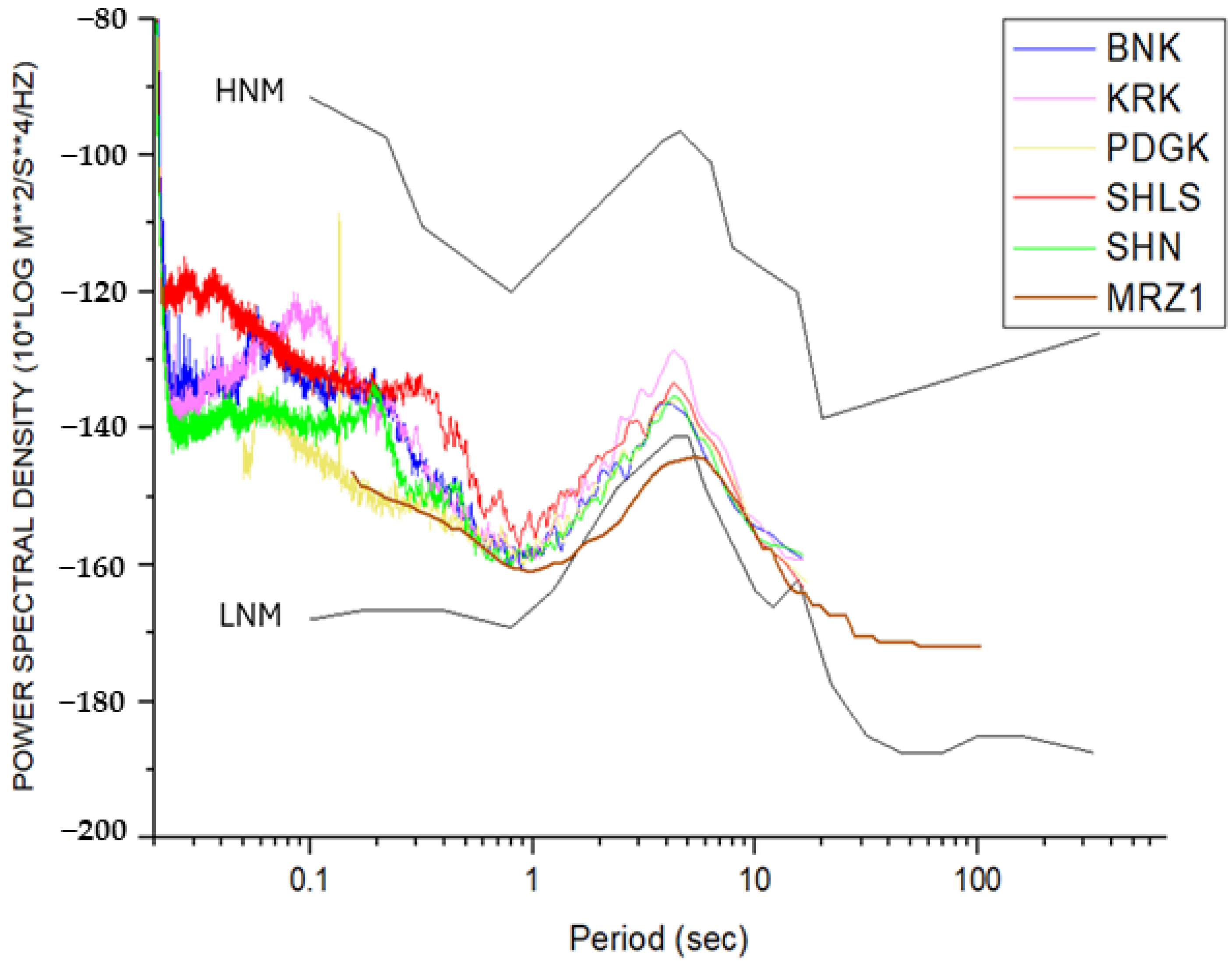 Figure 10). The black lines show the standard high-level and low-level seismic noise curves (High Noise Model and Low Noise Model) according to Peterson [