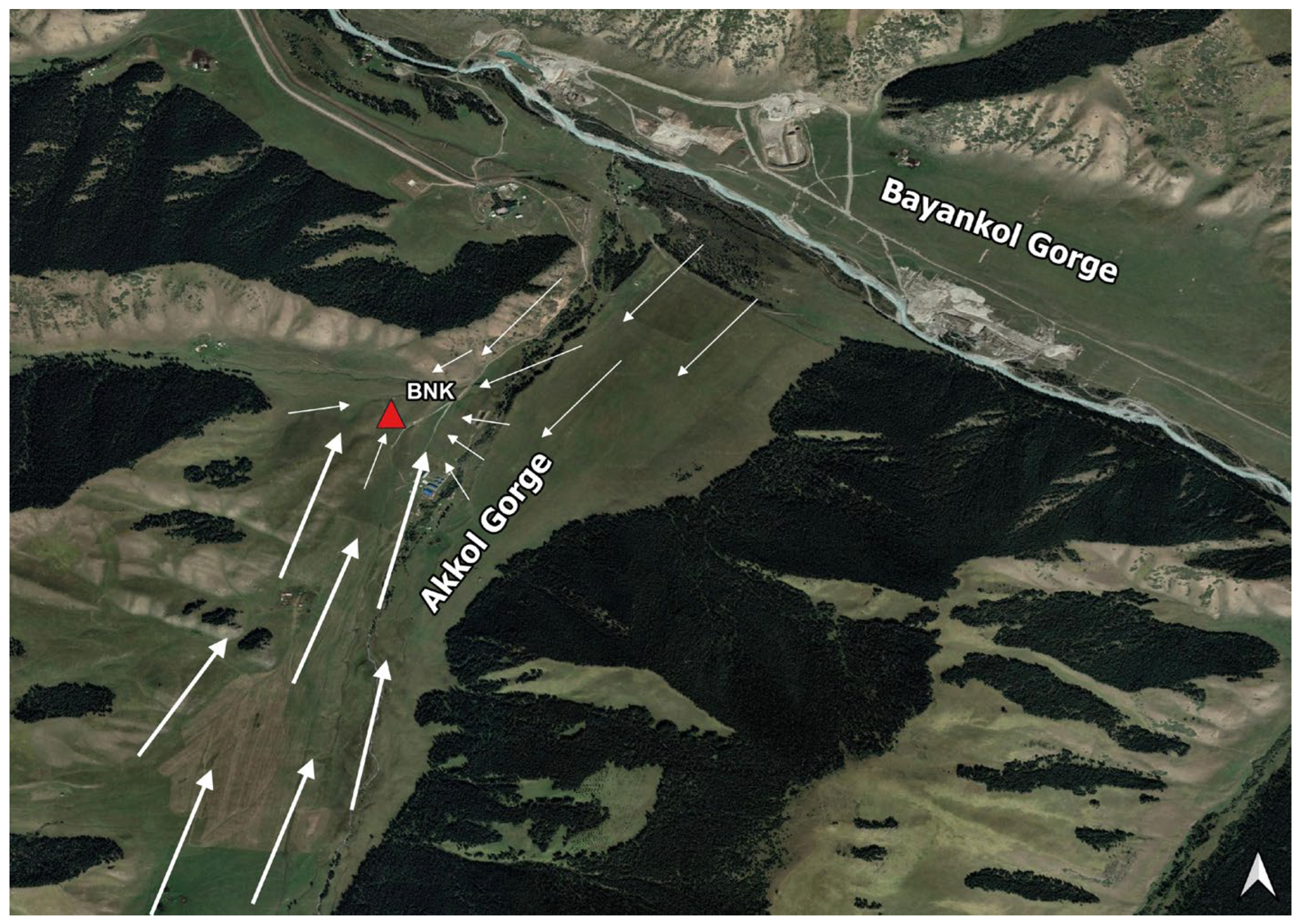 Bayankol (BNK) is located in the Bayankol Gorge, Akkol area. The site is a small intermountain valley where two mountain gorges converge. In the northern part of the valley, filled with loose sediments, there is a gentle elevation—a remnant with fragments and outcrops of coarse-grained quartz–feldspar granites (