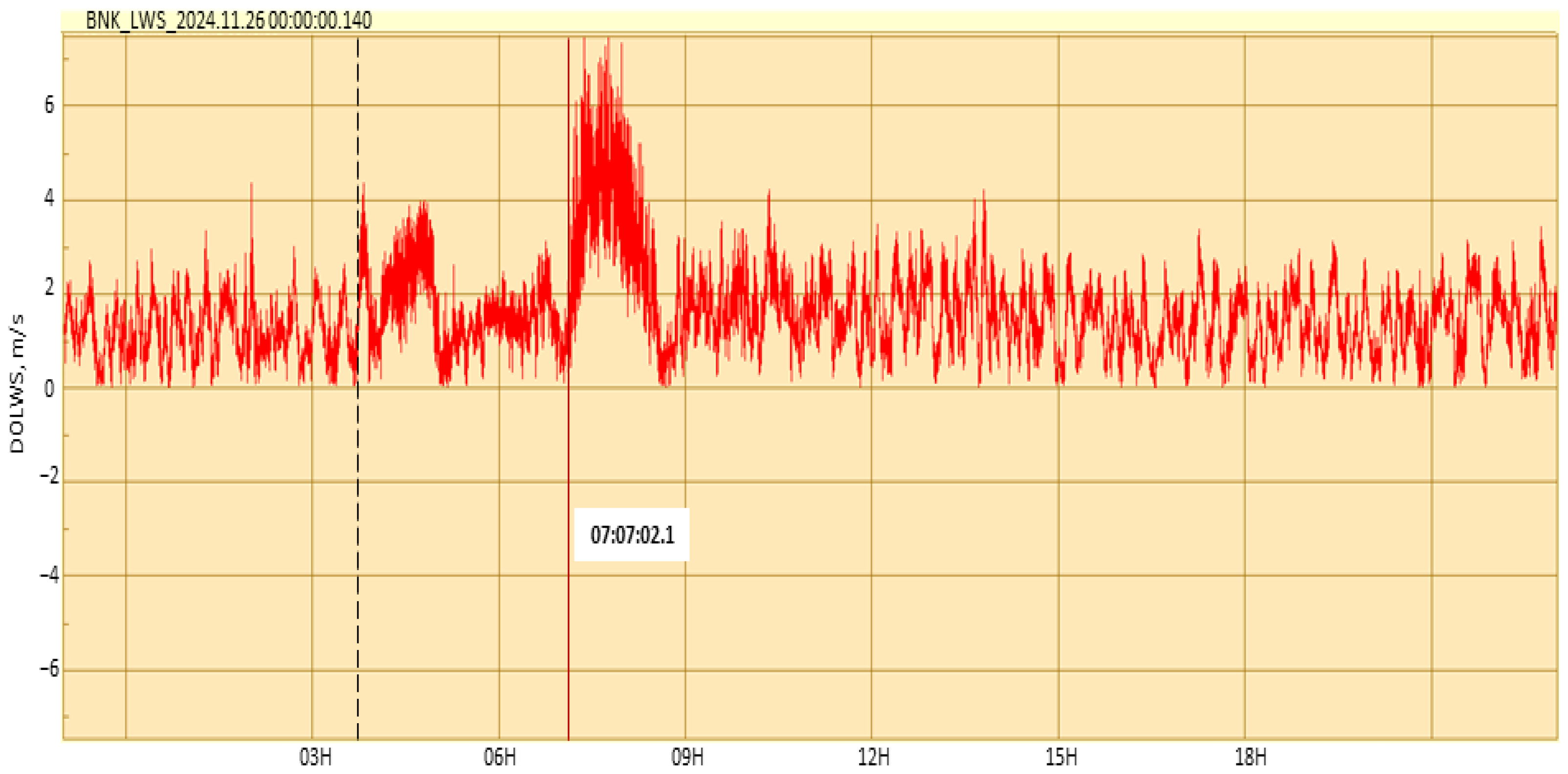 Figure 17 show that the time of wind speed increase and the time of the beginning and duration of intensive infrasound noise are completely synchronous in the microbarometer records.