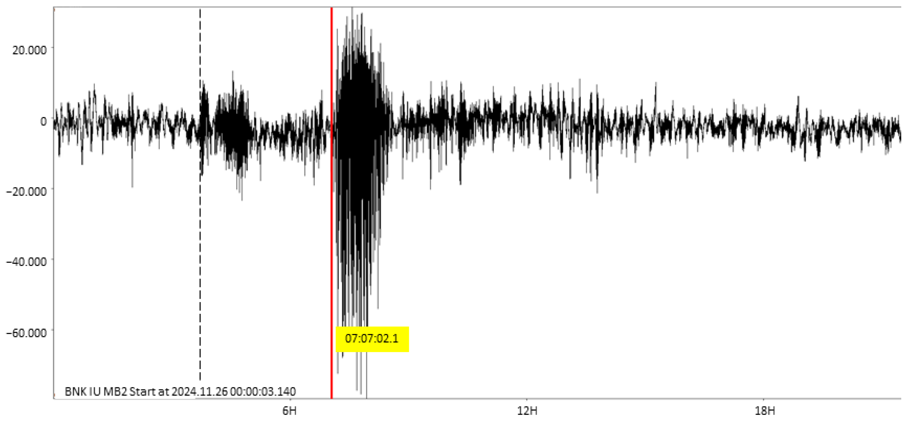 Figure 12 shows seismograms from field stations for one day, Z components. The station traces in the figure are arranged from top to bottom according to their distance from the glacial zone (60 km Bayankol, 75 km Shynybek, 135 km Karkara).