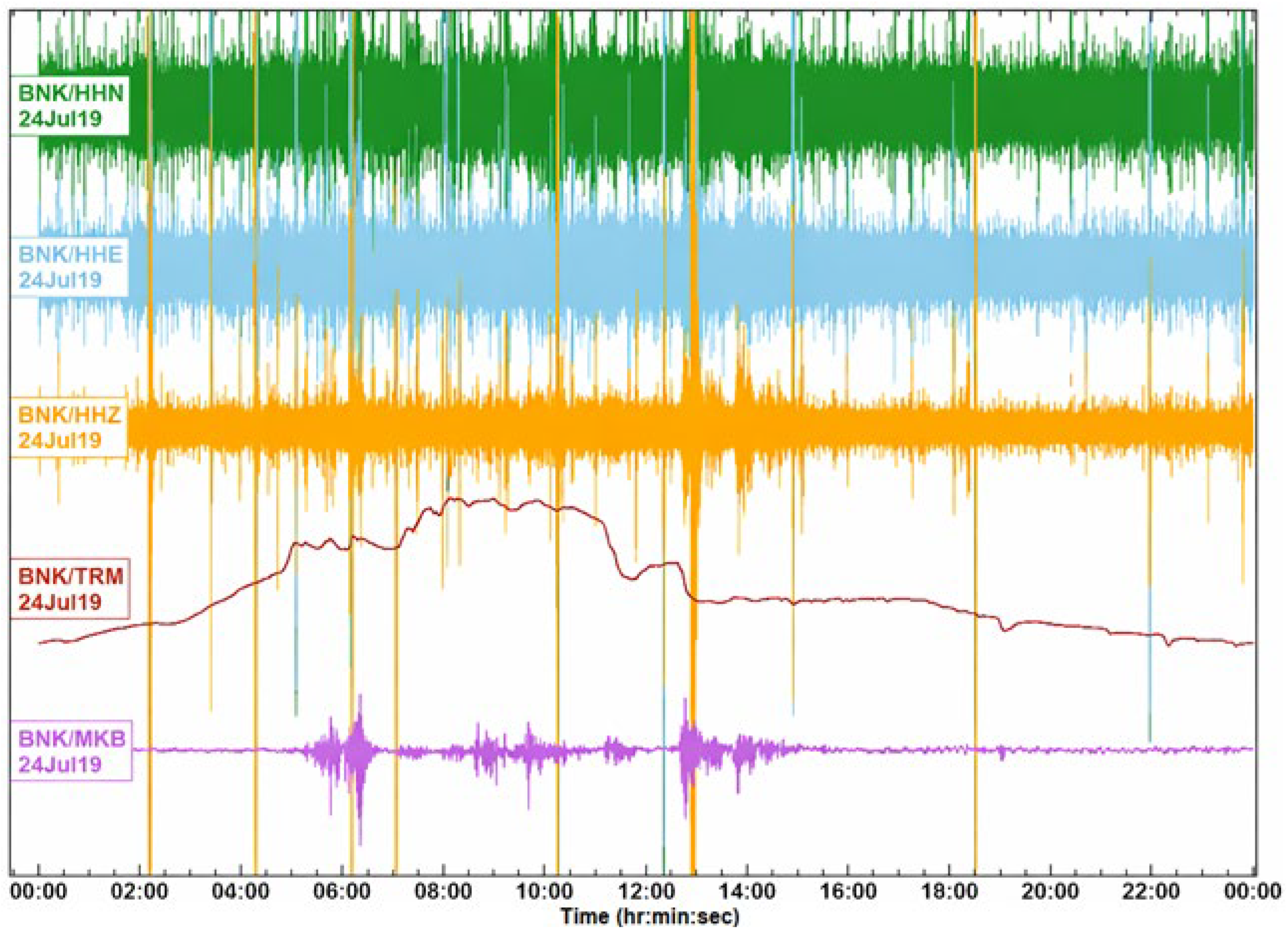 Figure 18 shows a summary graph of temporal changes by a set of data from a multi-parameter system. Three components of seismic station records, temperature records, and infrasound station records are shown.