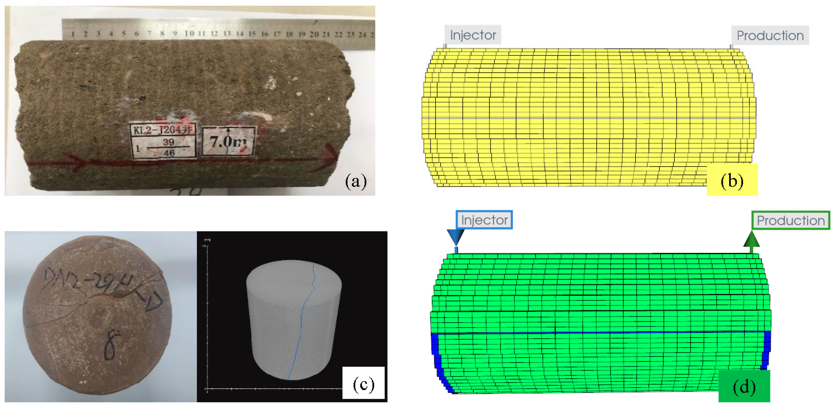 The experimental core samples used in this research ((a): homogeneous core, (c): fractured core) and the corresponding numerical simulation models ((b): homogeneous core, (d): fractured core).