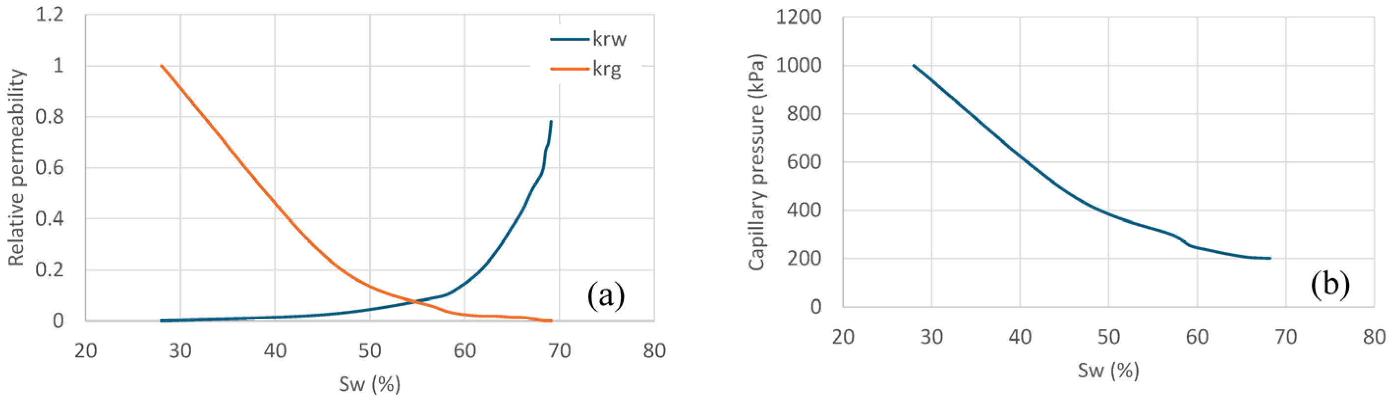 For the rock–fluid interaction functions, the core-scale flow dynamics were governed by experimentally derived relative permeability and capillary pressure curves, as shown in