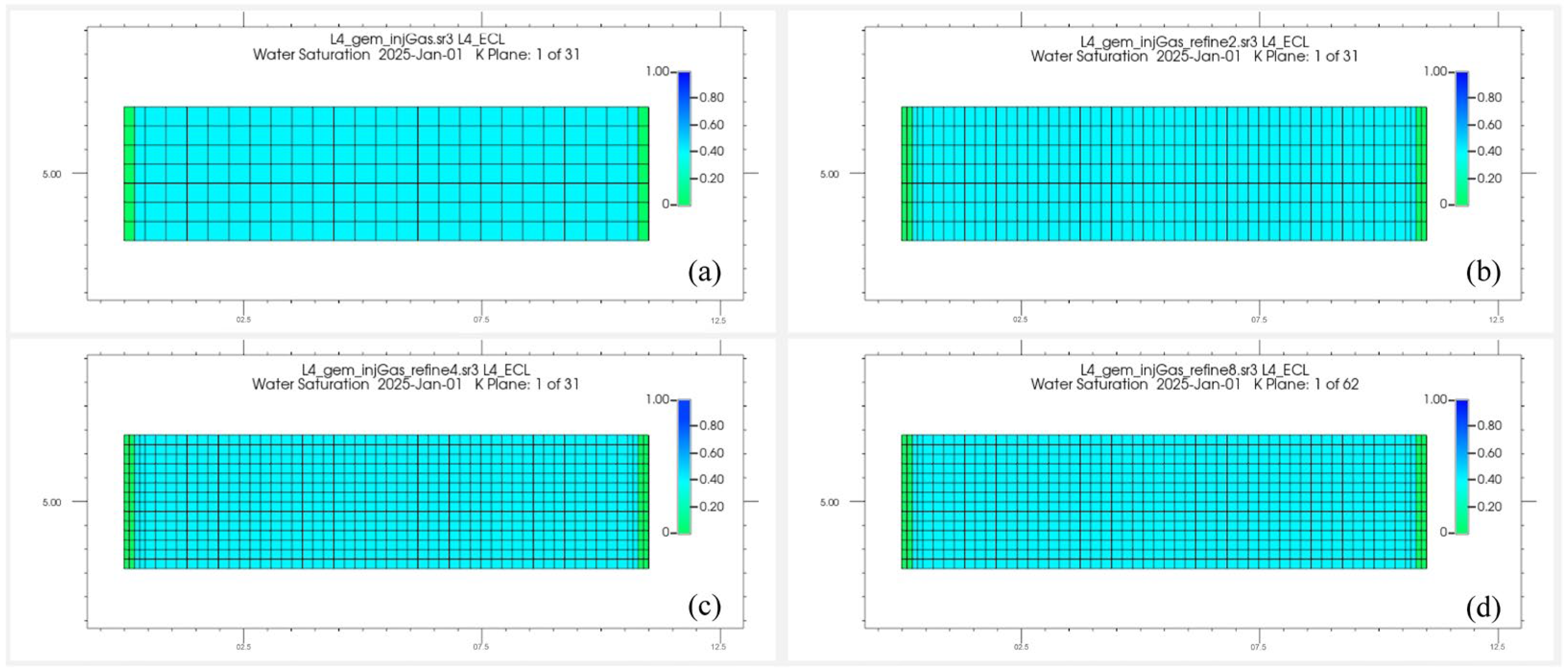 A digital twin of the core flooding experiment was developed using structured grids (31 × 25 × 27, totaling 20,000 cells) to resolve core-scale gas–water flow dynamics (