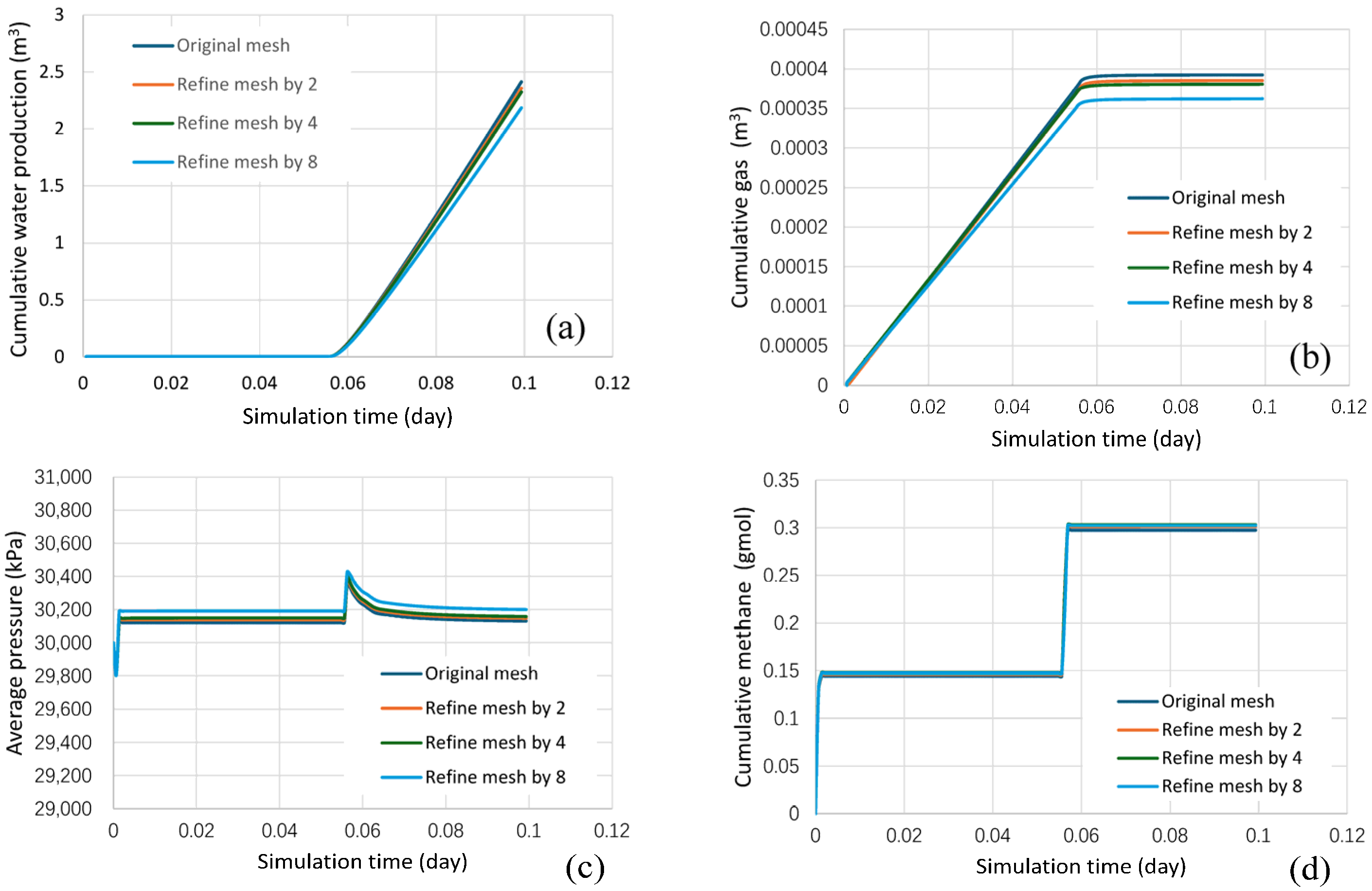 Predicted results under different grid refinements: (a) cumulative gas production; (b) cumulative water production; (c) average reservoir pressure; (d) methane mole production.
