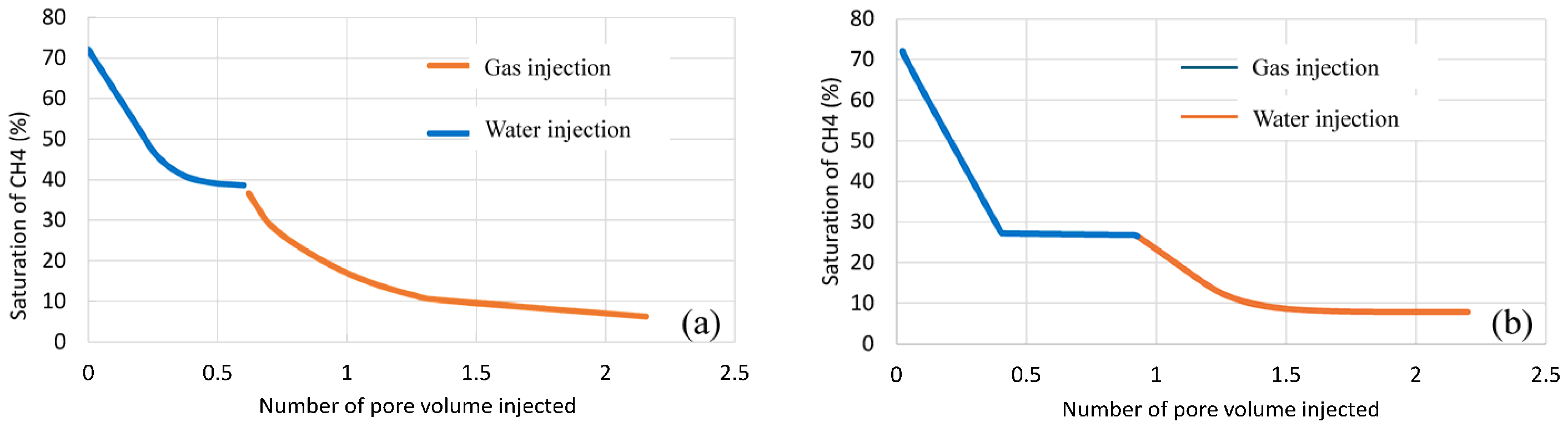 Methane saturation profiles during water–gas flooding in homogeneous cores: (a) experimental and (b) numerical simulation results.