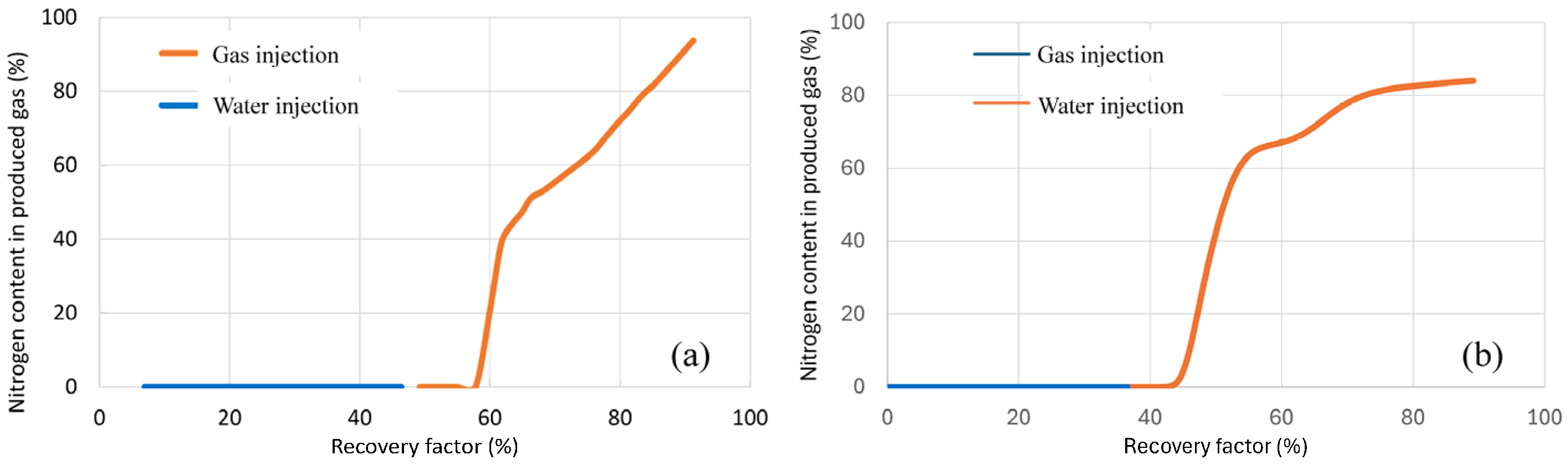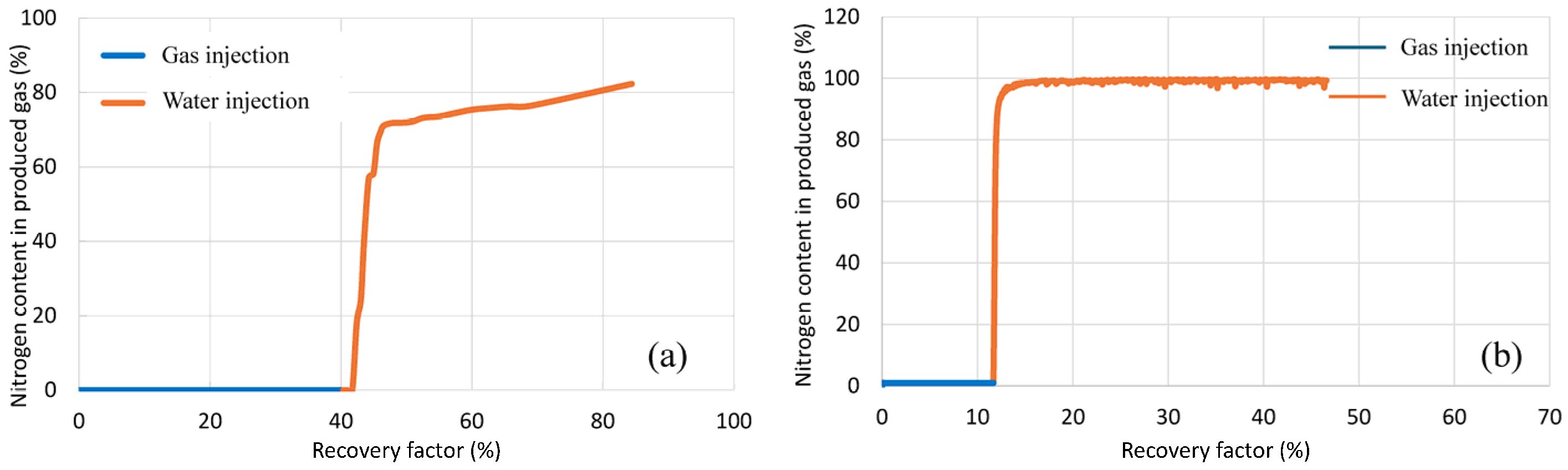 Nitrogen content at production end during water–gas flooding in fractured-porous cores: (a) experimental and (b) numerical simulation results.