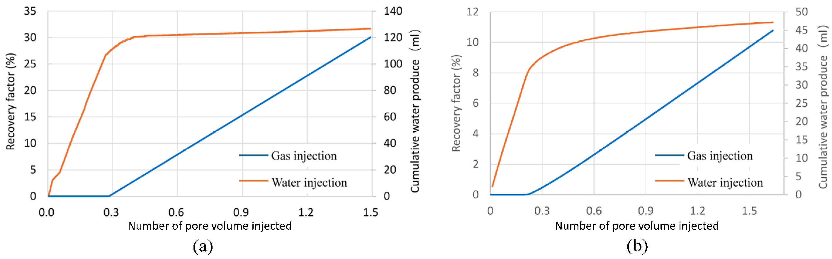 Methane recovery factor and cumulative water production during water–gas flooding in fractured-porous cores: (a) experimental and (b) numerical simulation results.