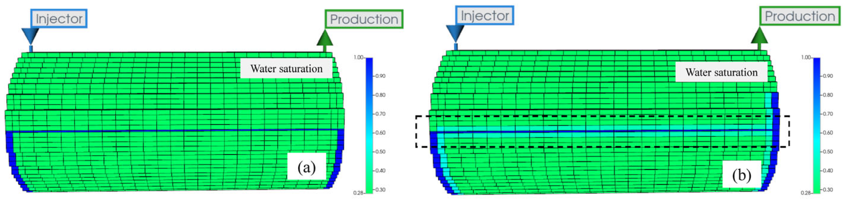Water saturation distribution for cases = 100 (a) and = 6000 (b).
