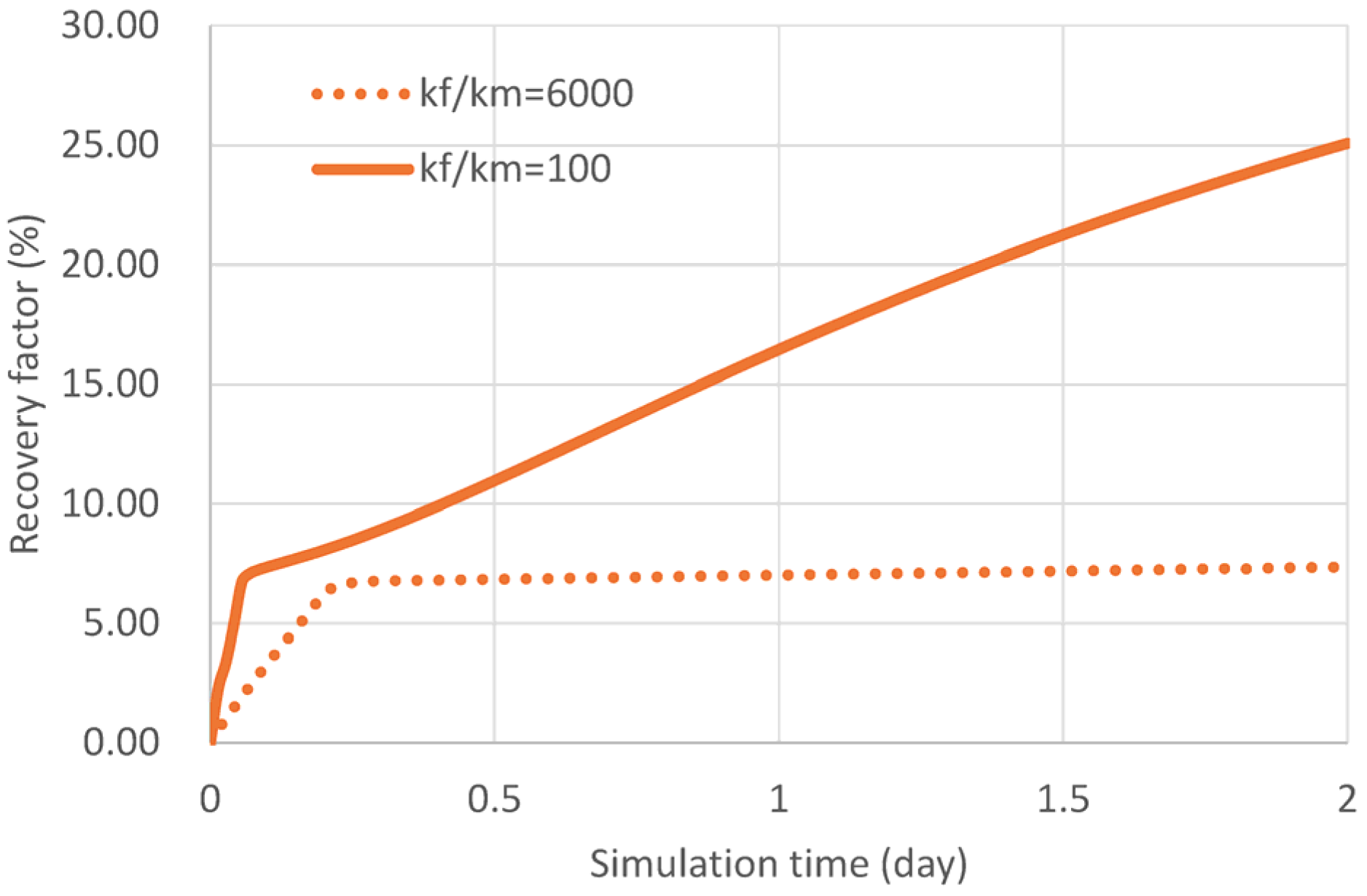= 100) achieved a recovery factor of 25.2%, whereas the high-contrast scenario (