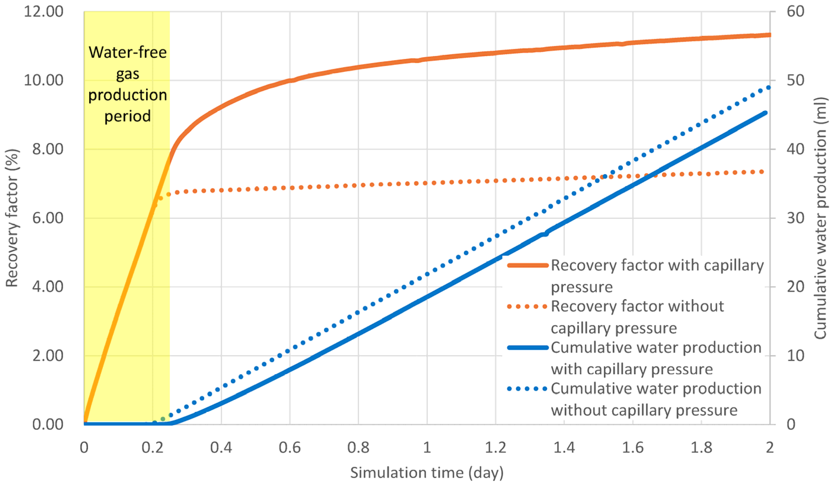 Methane recovery (orange) and cumulative water production (blue) with (solid) and without (dashed) capillary pressure.