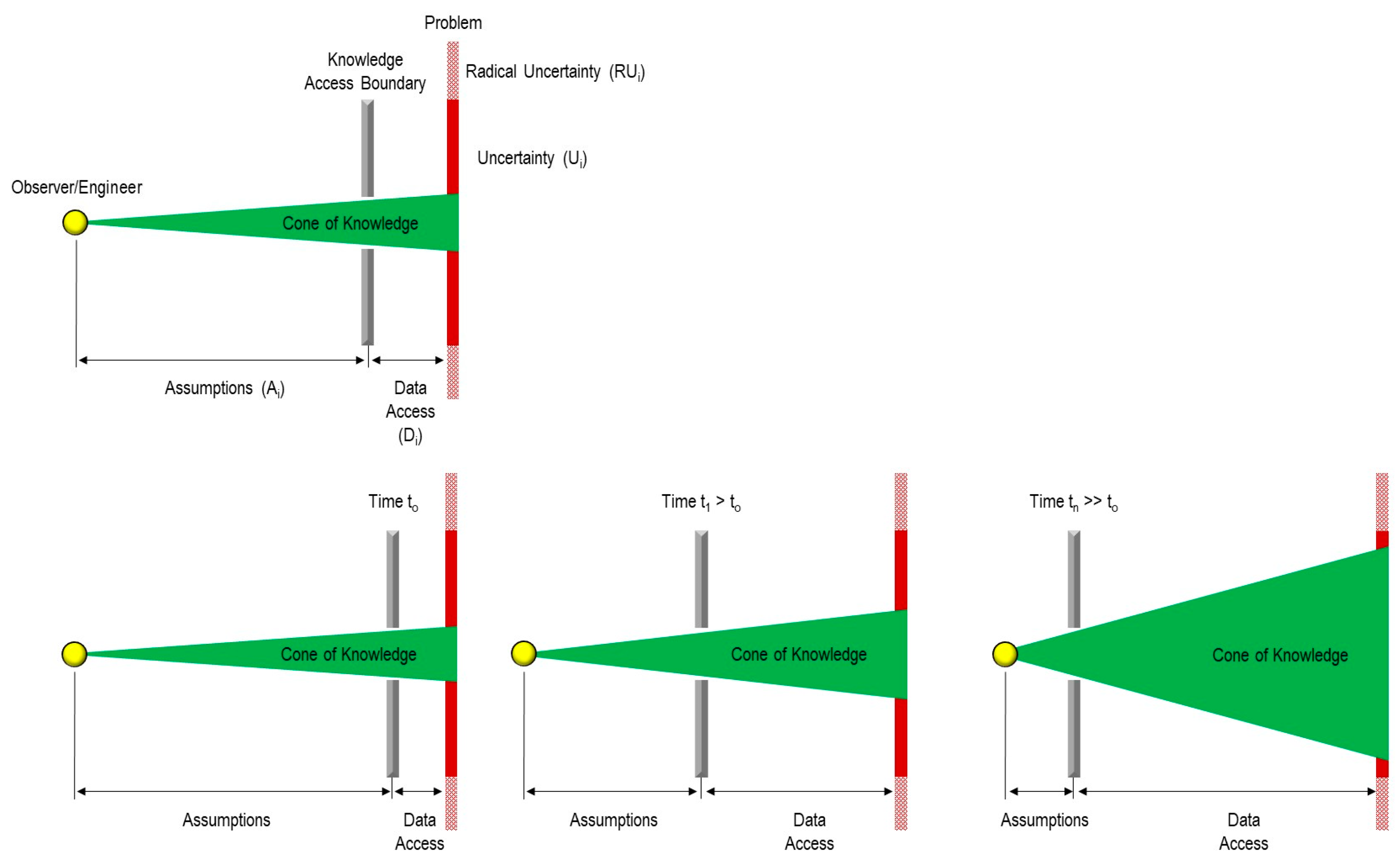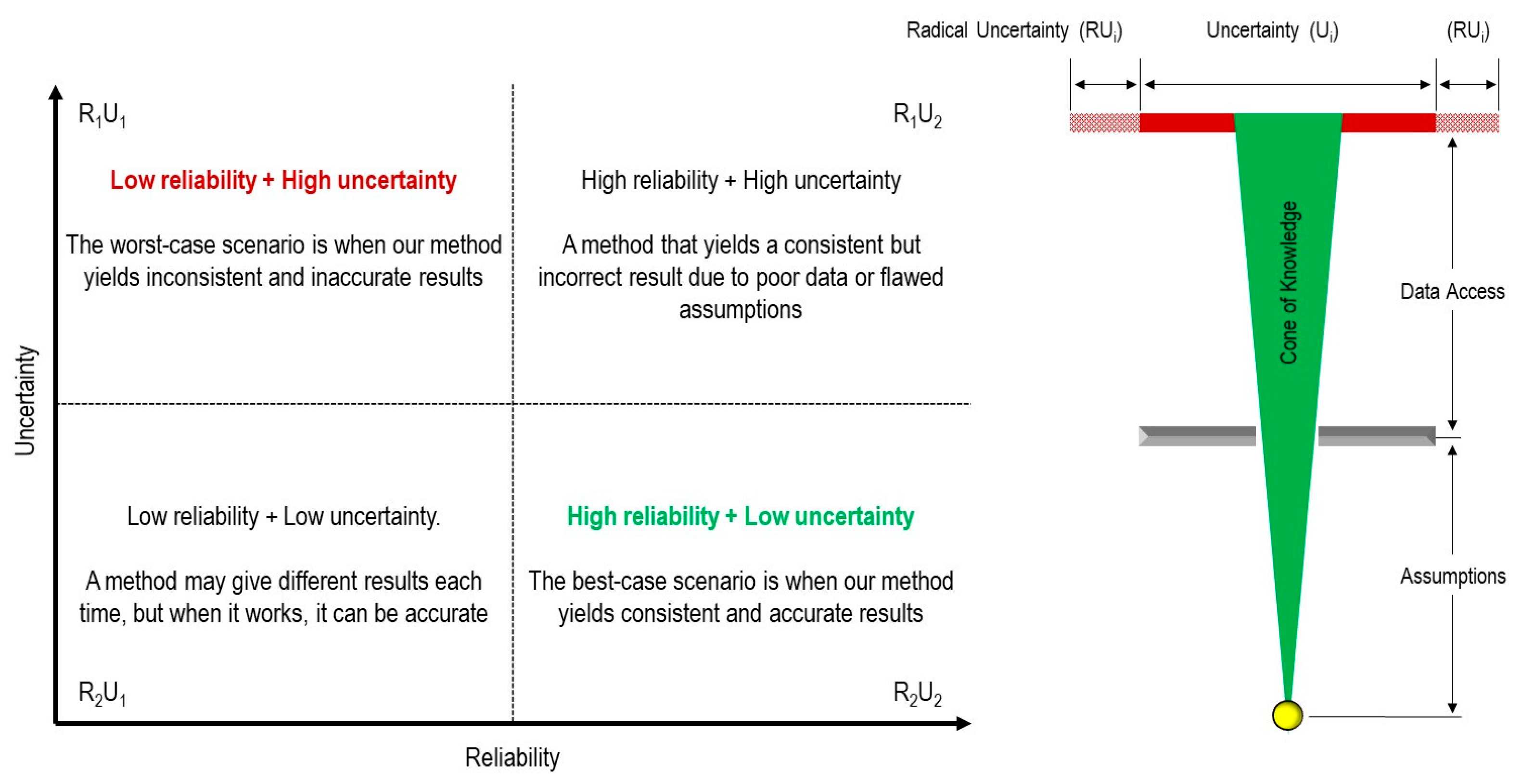 Figure 14. Reliability–uncertainty space. The cone of knowledge illustrates how uncertainty diminishes with access to data. However, radical uncertainty persists beyond data-driven reduction.