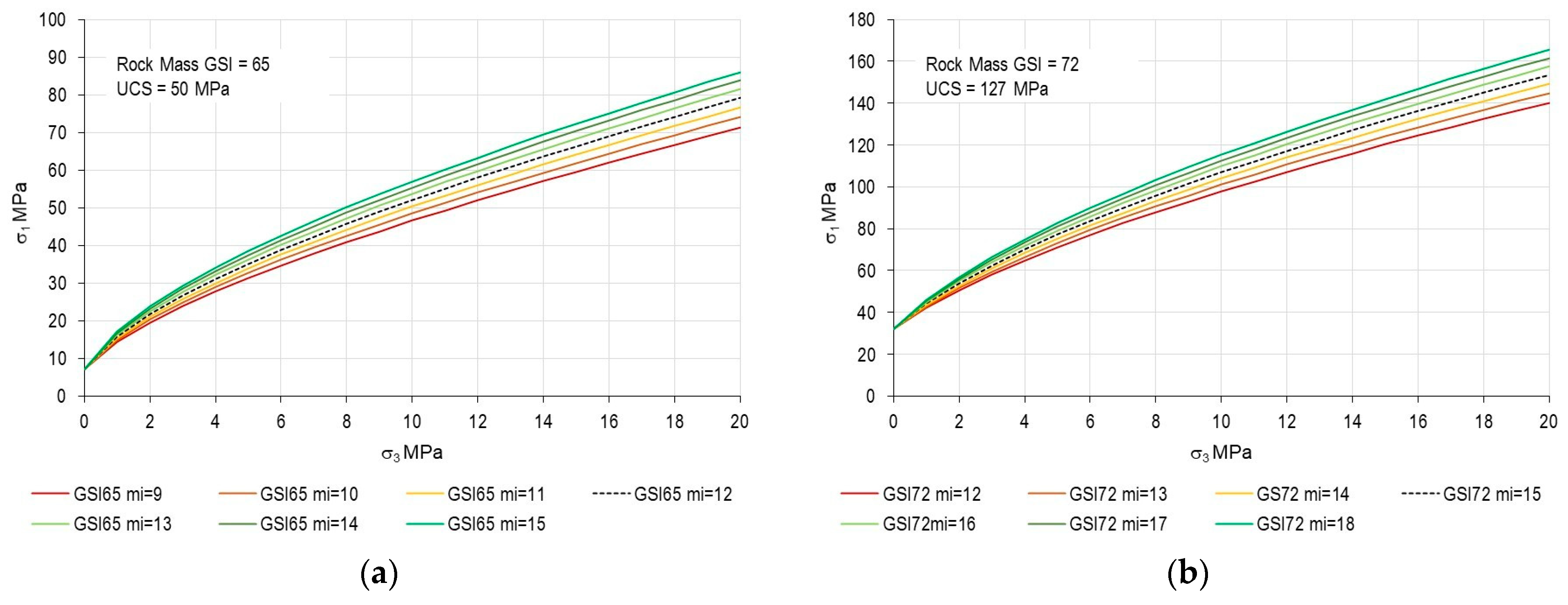 Using data for Middleton mine [14] and an undisclosed mine location [15], Figure 3a,b shows how the parameter mi affects the shape of the resulting Hoek–Brown failure envelope for different GSI (±5) and σci (assumed equal to the average UCS). For the two cases under consideration, the influence of mi variations is most significant at low confining stresses, ranging from 0 to 2 MPa. While this analysis examines the compressive stress region, comparable effects would be anticipated in the tensile regime.