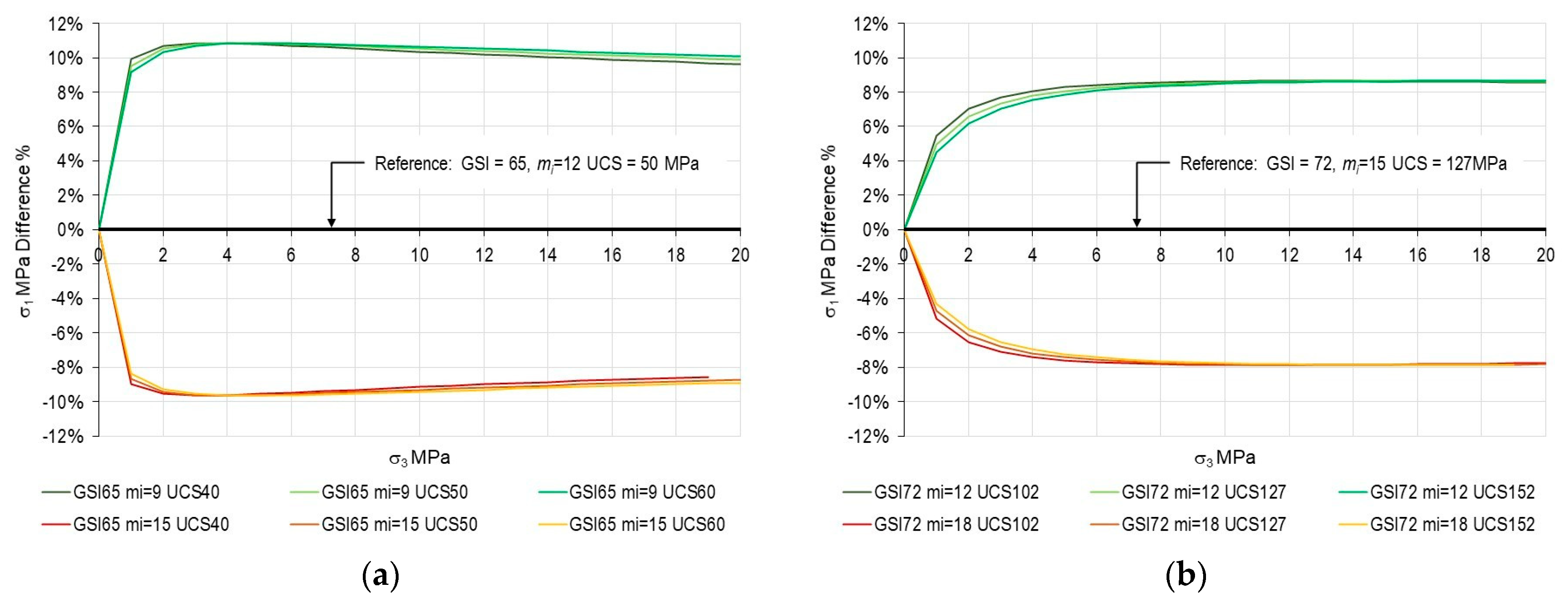 Figure 4. (a) Sigma 1 percentage difference using UCS = 50 MPa, GSI = 65, and mi = 12 as reference, with cases for UCS = 50 ± 10 MPa, GSI = 65, and mi = 12 ± 3, and (b) Sigma 1 percentage difference using UCS = 127 MPa, GSI = 72, and mi = 15 as reference, with cases for UCS = 127 ± 25 MPa, GSI = 72, and mi = 15 ± 3. Data from Middleton mine [14] and (b) data from an undisclosed mine location [15].
